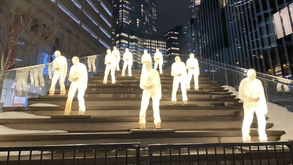- Two bronze plaques on the sculpture’s base show Eriksson and his crew landing on a rocky shore and, later, sharing the story of their discovery.