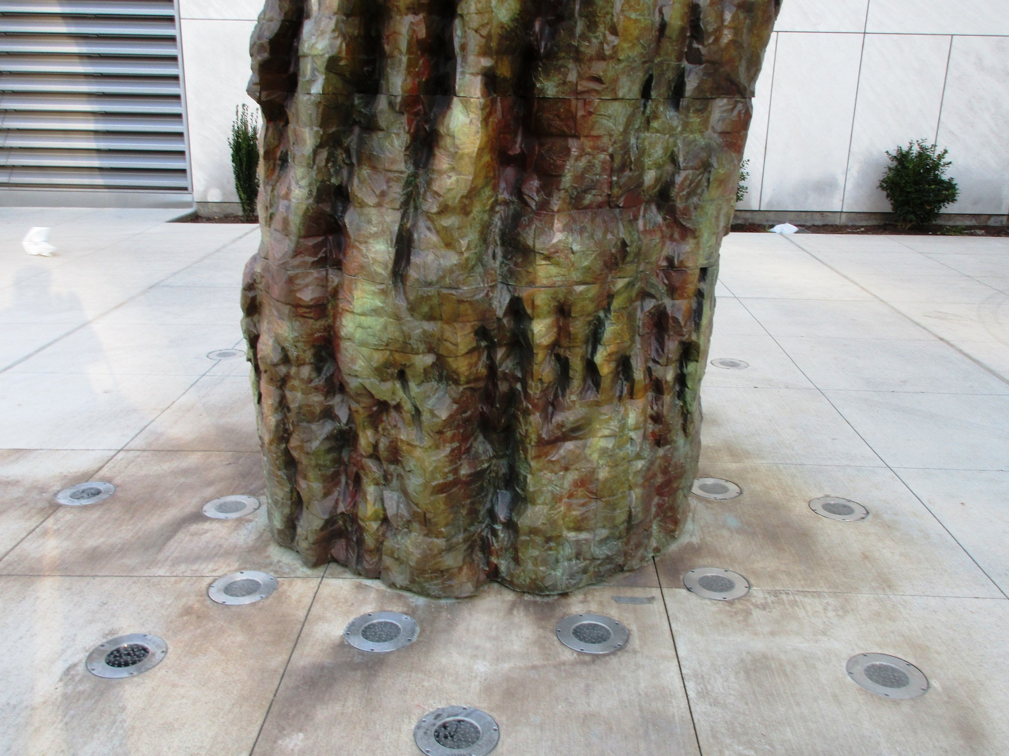 - The surface texture of the sculpture shifts from a gently carved base to a craggy and knotted midsection to gentle undulations that climb around the top of the volume.