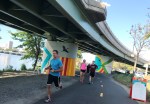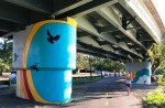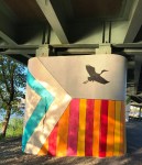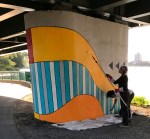 - “Elements of the mural unfold as the viewer approaches the work from the east, starting with swaths of color on the pillars and growing in detail and vibrancy into a crescendo on the 120’x13’ wall facing the Charles River. “