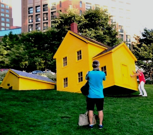 - The sculpture references two significant parts of New England history: the small house-like structure is a reminder of the thousands of displaced residents and demolished homes that resulted from the city’s elevated highway infrastructure project, and the larger house is inspired by the Pembroke Friends Meeting House, which is the oldest surviving Quaker meetinghouse in Massachusetts.