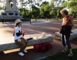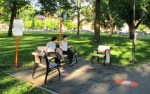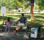 - Songs, poetry, and quotations echo from a marked bench as two people sit and touch hear-shaped plates to complete an electric circuit to run the speaker system,