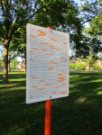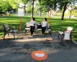 - Songs, poetry, and quotations echo from a marked bench as two people sit and touch hear-shaped plates to complete an electric circuit to run the speaker system,