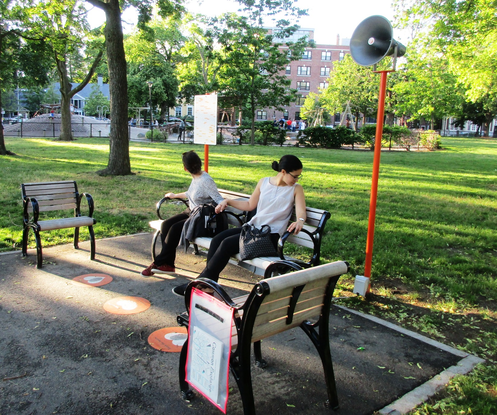 - Songs, poetry, and quotations echo from a marked bench as two people sit and touch hear-shaped plates to complete an electric circuit to run the speaker system,