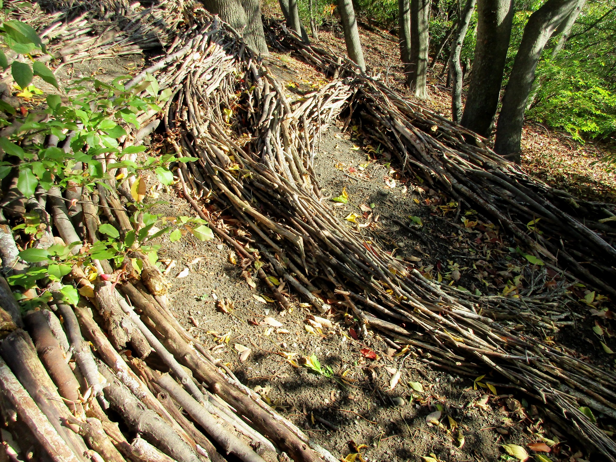- “Current,” created by Provincetown artist Frank Vasello, creates a river of sticks moving down a hill near the Spy Pond Park playground.