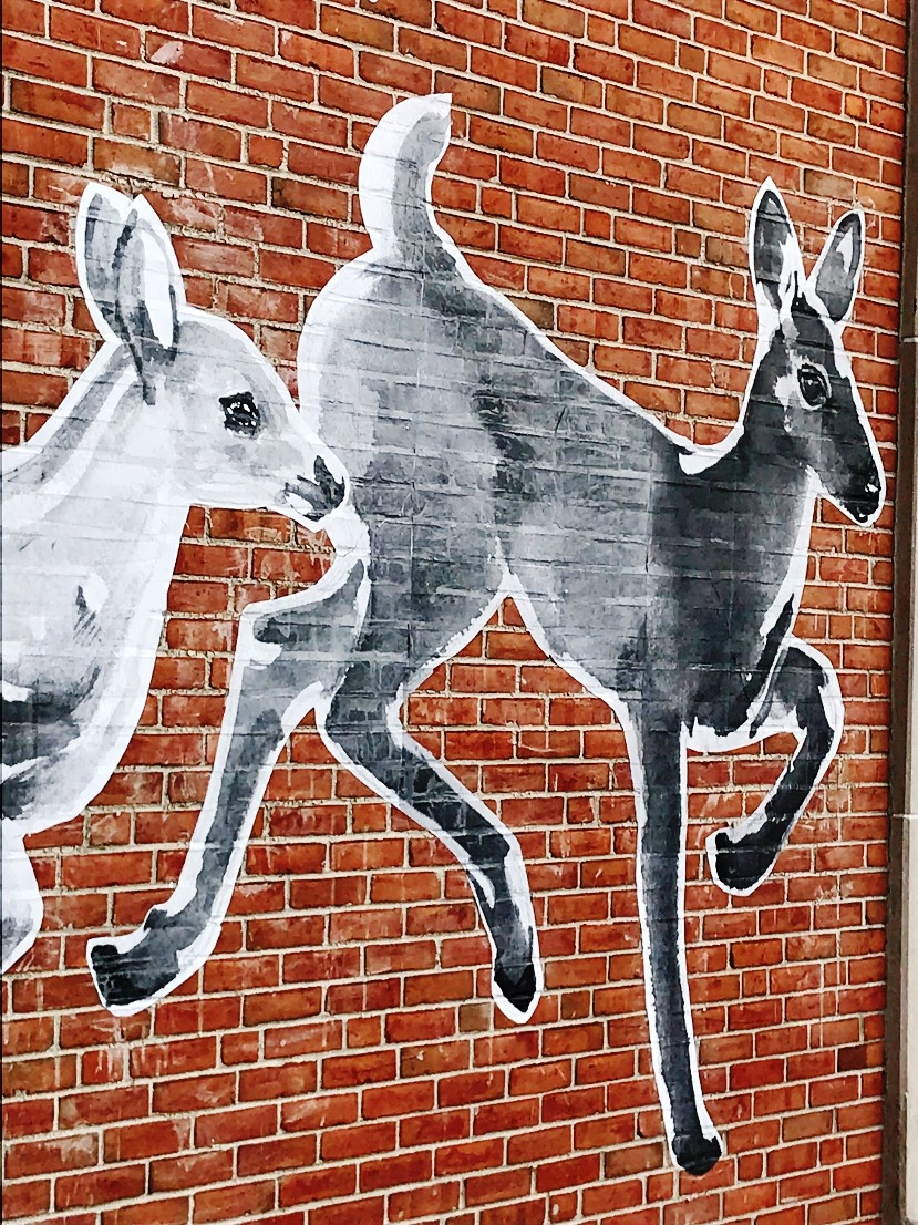 Have you noticed the large deer, bear, fish, and fox families gathered on the walls of the Fox Branch Library in Capitol Square, East Arlington? This temporary installation uses a street art technique called “wheat paste” to attach giant versions of small scale drawings to brick walls, transforming an intimate art form into the scale needed to fill a public space.