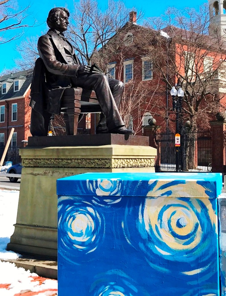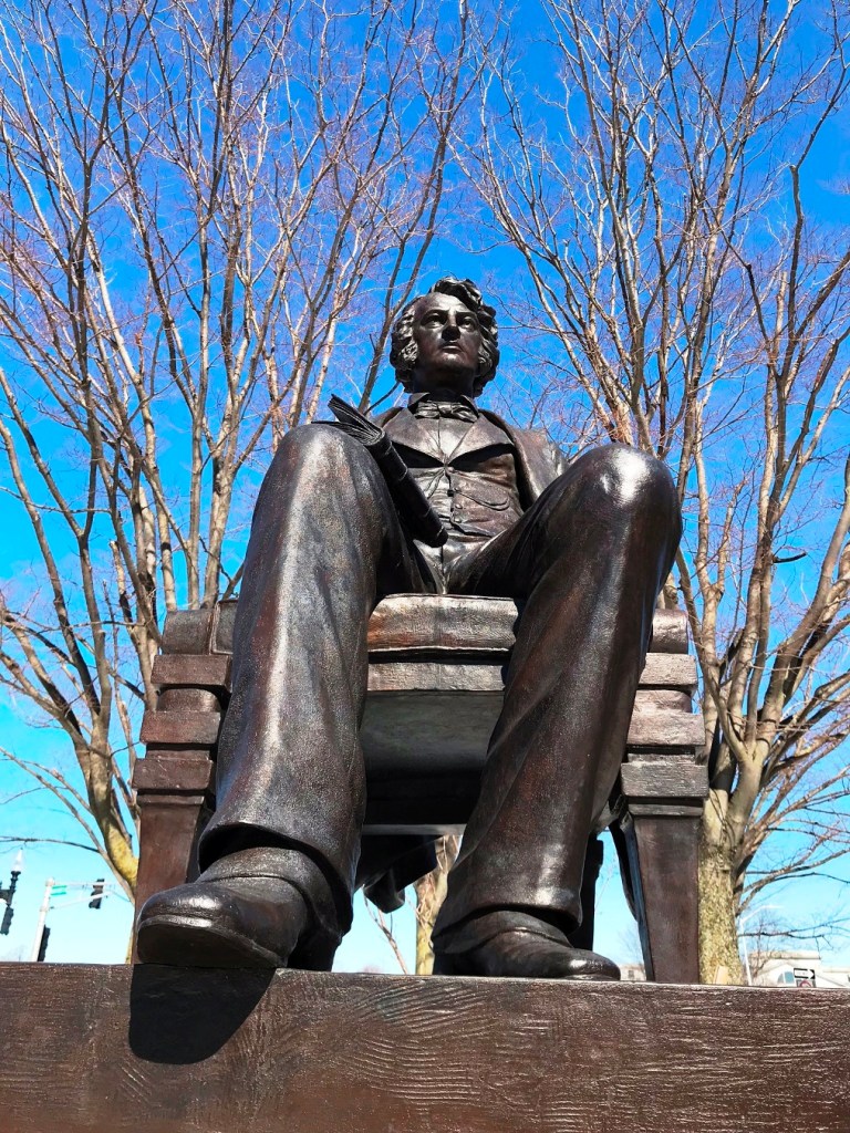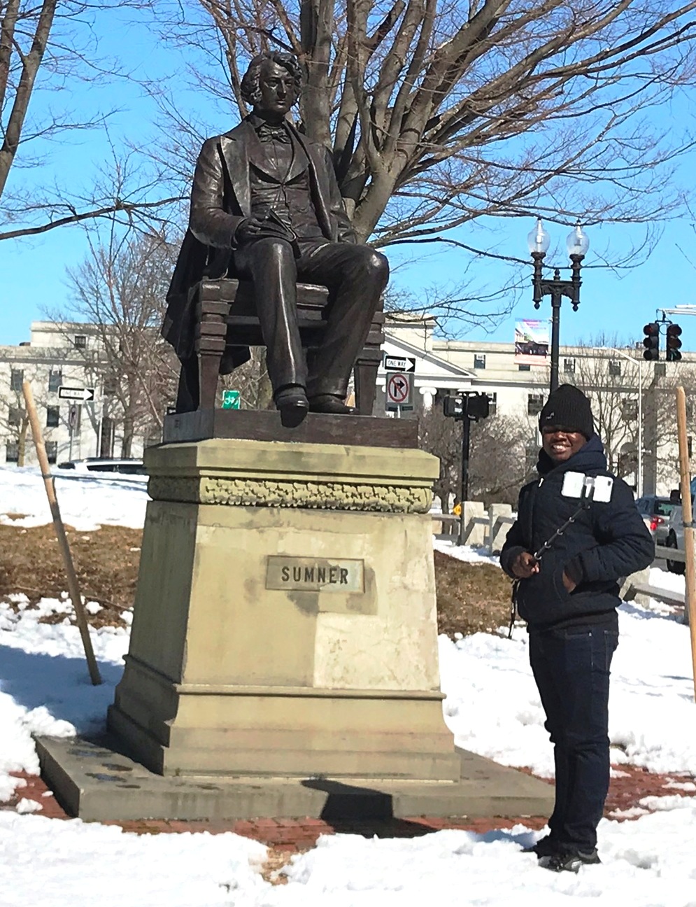 “Shortly after Sumner’s death in 1874, a competition was held to design a monument to him. Boston artist Anne Whitney initially beat out a roster of well-known competitors…. Nevertheless, the judges disqualified Whitney when they discovered she was a woman. Claiming that it would be improper for a woman to sculpt a man’s legs, they chose Thomas Ball’s design instead—an ironic story behind an artwork intended to honor Sumner’s fight for equality. Twenty-seven years later, Whitney cast her original design in bronze, with a few minor alterations. It is now located in Harvard Square.” ( quote from Public Art Boston about Sumner statue)