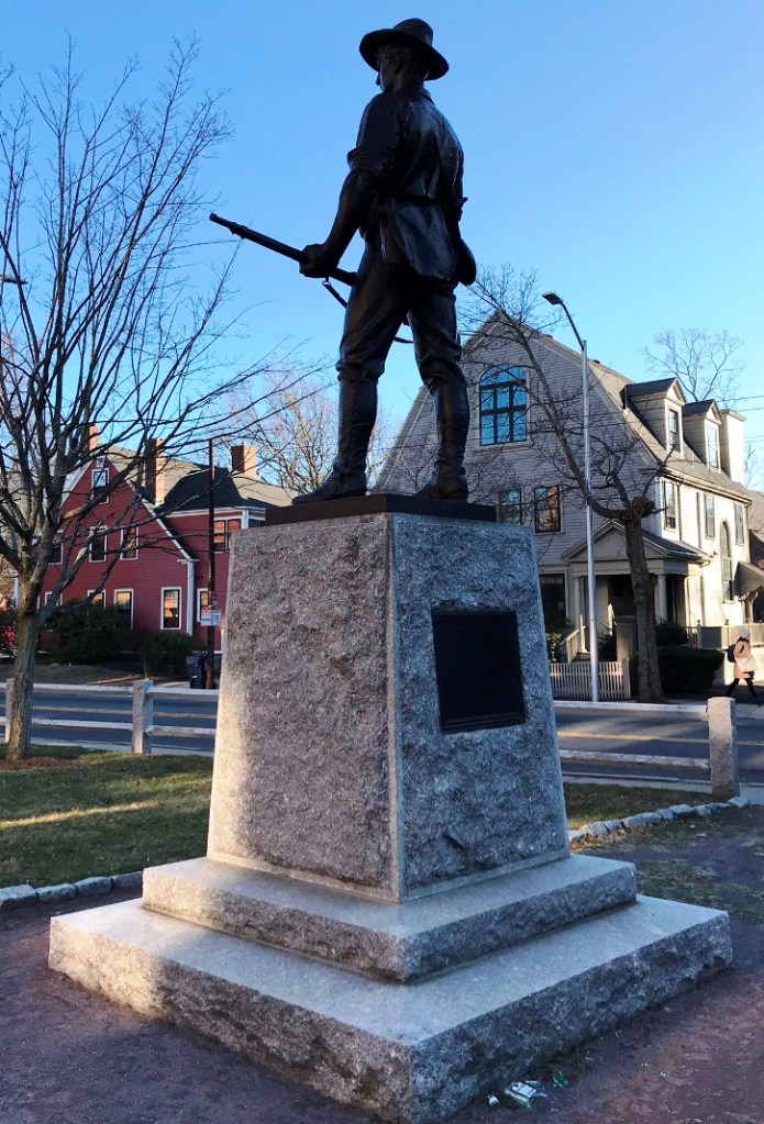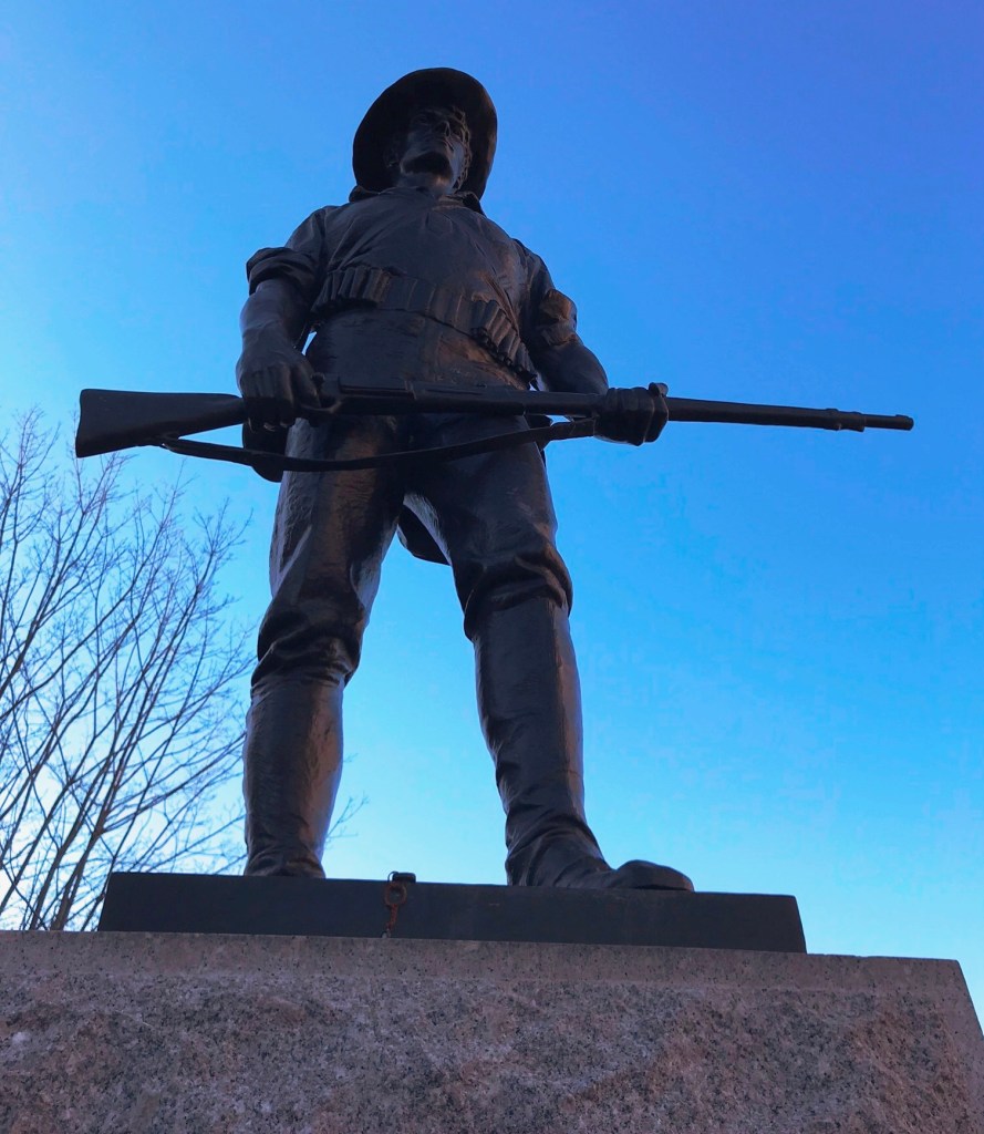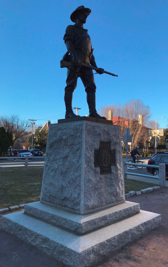 “The Hiker is a statue created by Theo Alice Ruggles Kitson. It commemorates the American soldiers who fought in the Spanish–American War, the Boxer Rebellion and the Philippine–American War. The first version of it was made for the University of Minnesota in 1906, but at least 50 copies were made, and were erected very widely across the United States. …. Kitson’s work proved to be very popular, largely because of its realism and historical accuracy. In 1921, the Gorham Manufacturing Company, located in Providence, Rhode Island, bought the rights to the statue, and over the next 44 years Gorham cast at least 50 Hiker statues.