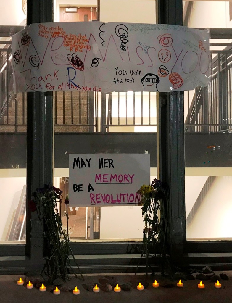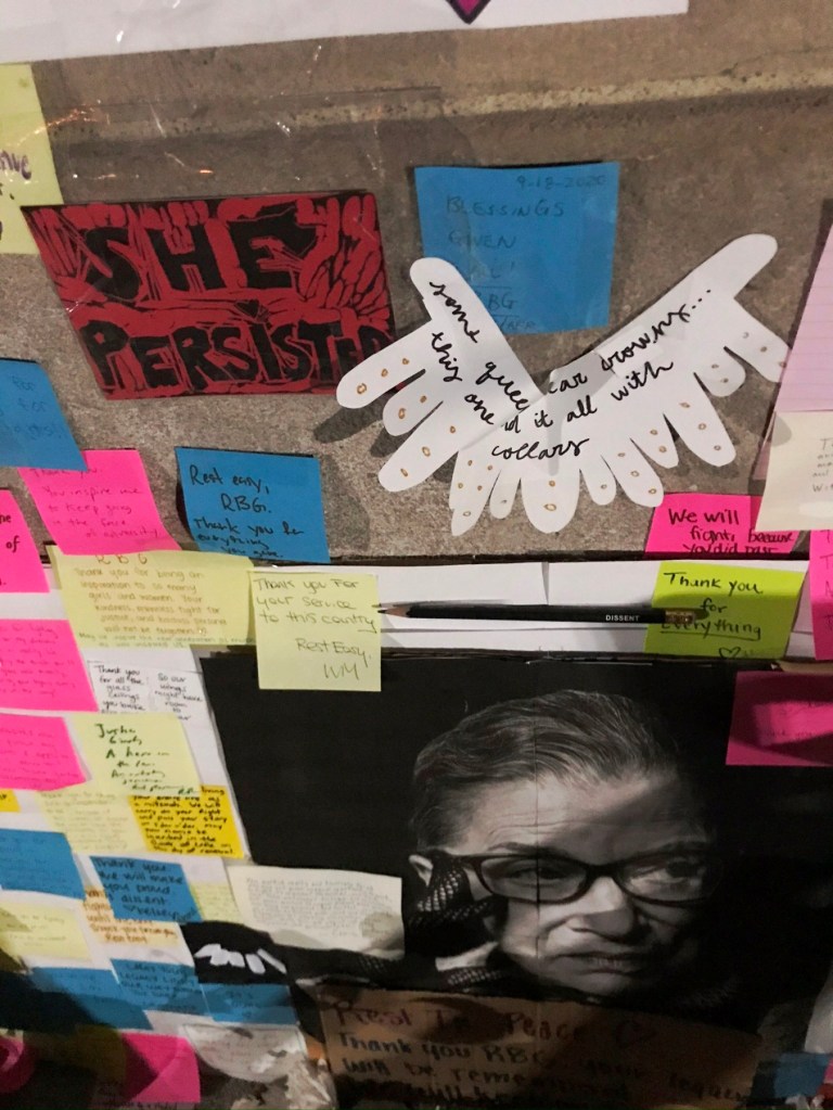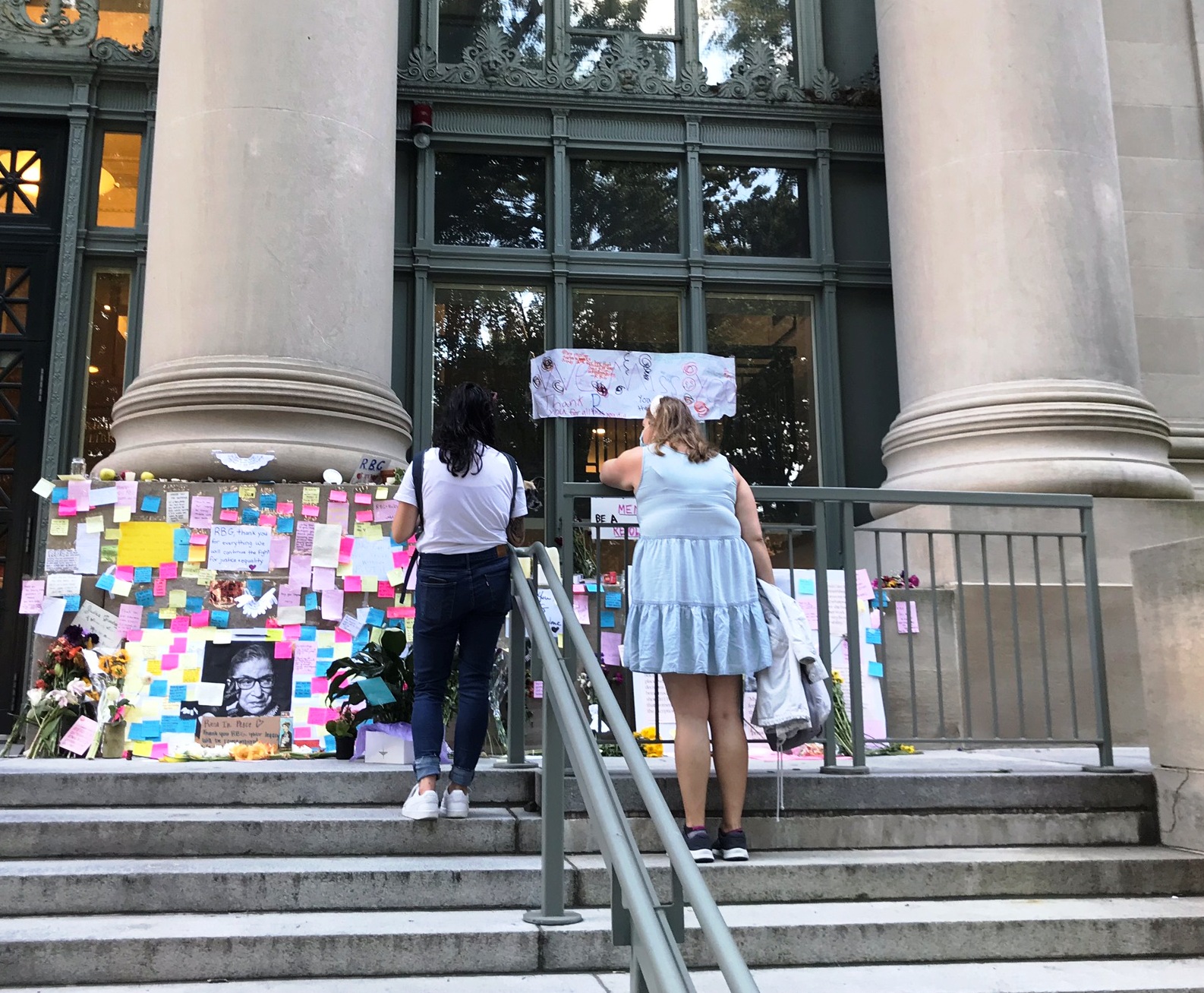 “A growing collection of flowers, posters, hand-written notes and low-burning candles have accumulated on the steps of the Harvard Law School library, a makeshift memorial assembled by Harvard students and admirers of the late alumnus and Supreme Court Justice Ruth Bader Ginsburg, who died Friday at the age of 87.” ( quote from WGBH local news Sept 20, 2020)