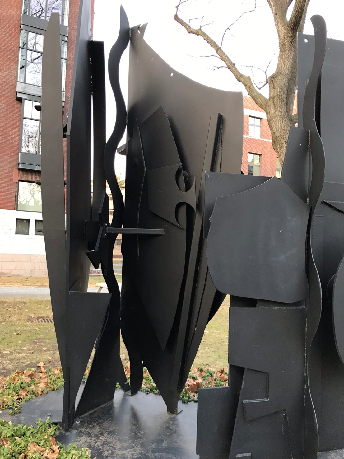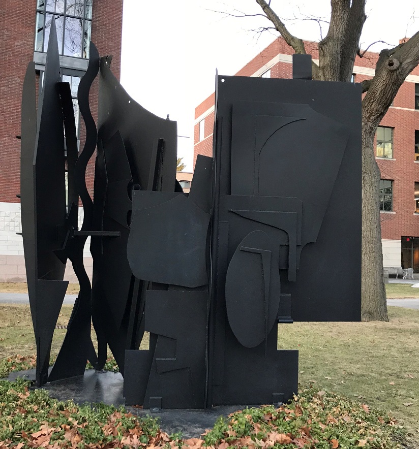 Since 1985, Louise Nevelson’s painted steel sculpture, Night Wall 1, has stood 12 feet tall on a lawn edged by several Harvard University buildings, including the law school library ( Langdell Hall). Last week for the first time I found a way to post about this admired art and artist, though I had meant to many times for many years. At the start of the Jewish New Year, 5781, Louise Nevelson’s monumental sculpture kept a steady silent vigil in view of a steadily growing memorial for Ruth Bader Ginsburg.