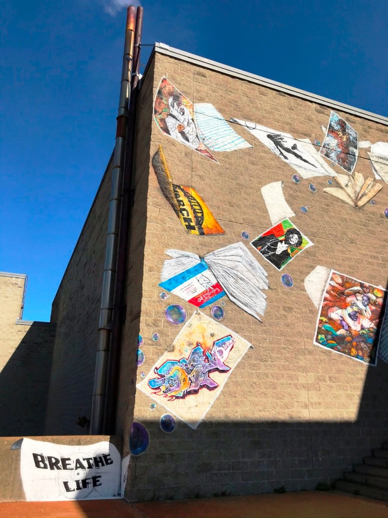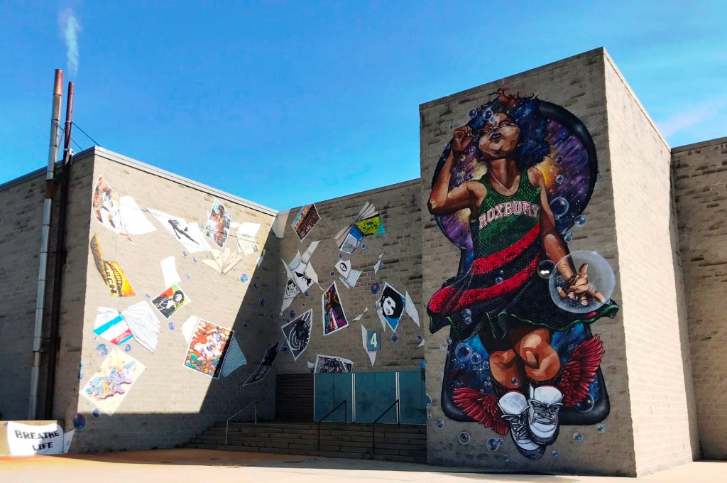 ““Breathe Life 2” is a towering, four-wall depiction of a young Black girl, the same girl who sits on the shoulders of her brother in “Breathe Life 3,” the Roxbury mural Gibbs completed last summer. (The original ”Breathe Life” depicts the boy alone and stands on Blue Hill Ave.) With the new mural, Gibbs pictures the girl blowing a large bubble — a trail of inspiring papers and books flies from her backpack, a clustered galaxy of stars and nebulae lives in her hair.” (quote from Boston Globe article by Diti Kohli June24, 2020)