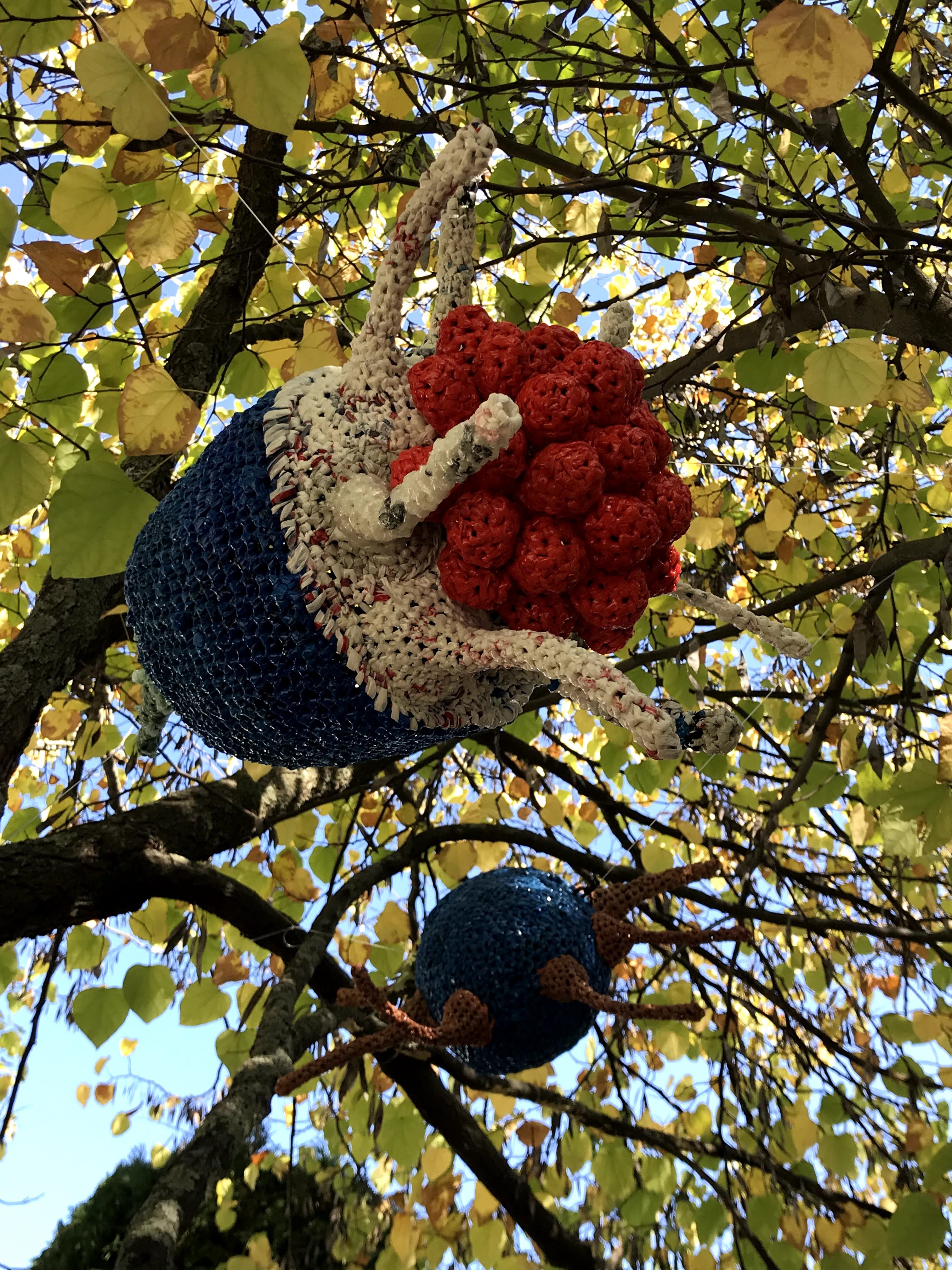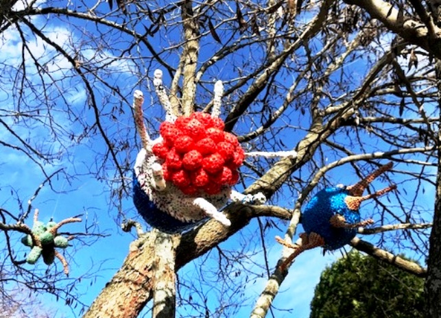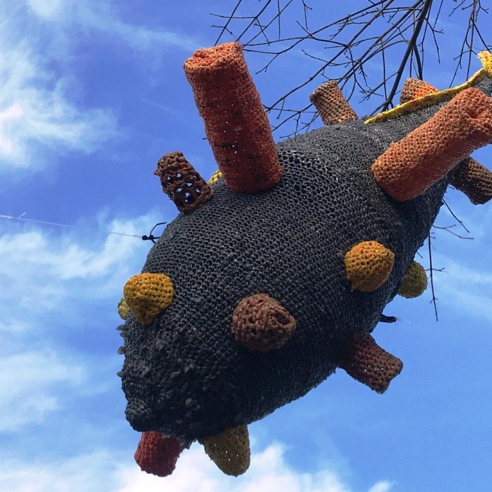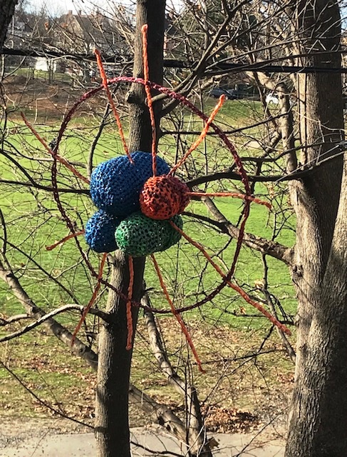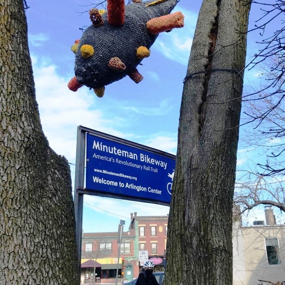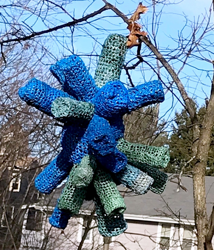 “The culmination of a year-long, town-wide collaborative project, Persistence: A Community Response to Pervasive Plastic comprises a series of 37 brilliantly colored forms inspired by microorganisms found naturally in water. Calling attention to microplastics that invade the marine ecosystem, they are fabricated from thousands of single-use plastic bags rendered into “plarn” or plastic yarn and crocheted by brigades of volunteer crafters led by noted fiber artist Michelle Lougee — the town’s first Artist-in-Residence.”(quote from Arts Arlington Calendar Nov 2020)
