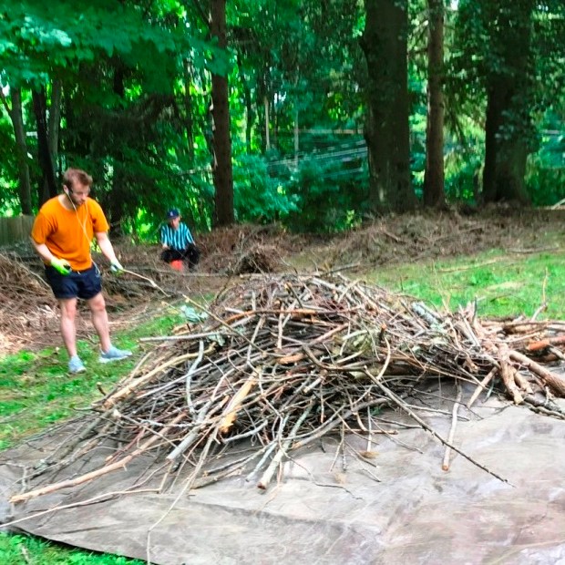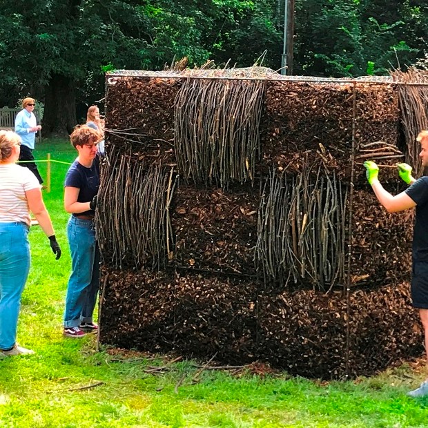 “Hassinger originally created her two large-scale works in deCordova’s Sculpture Park, Monument 3 (Standing Rectangle) and Monument 6 (Square), for Marcus Garvey Park in Harlem. Commissioned by the Studio Museum in Harlem, the sculptures are primary geometric forms, yet their textured surfaces echo the intricacies of natural growth. Branches, twigs, and sticks collected from the park and neighboring properties completely cover over the sculptures’ metal framework. Installed among deCordova’s trees and plantings, Monument 3 and Monument 6 become centerpieces for, and backdrops to, the activities in the Park, from strolling and picnicking to napping and contemplation. The twisted branches are woven tightly to create a cohesive volume, while subtly emphasizing the vertical and horizontal lines in the landscape. The Monuments were constructed at deCordova by volunteers in the summer of 2019, thus fusing the connection between community and nature that is crucial to Hassinger’s work.” ( quote from Trustees site for art in Sculpture Park, Monuments 3 and 6 )