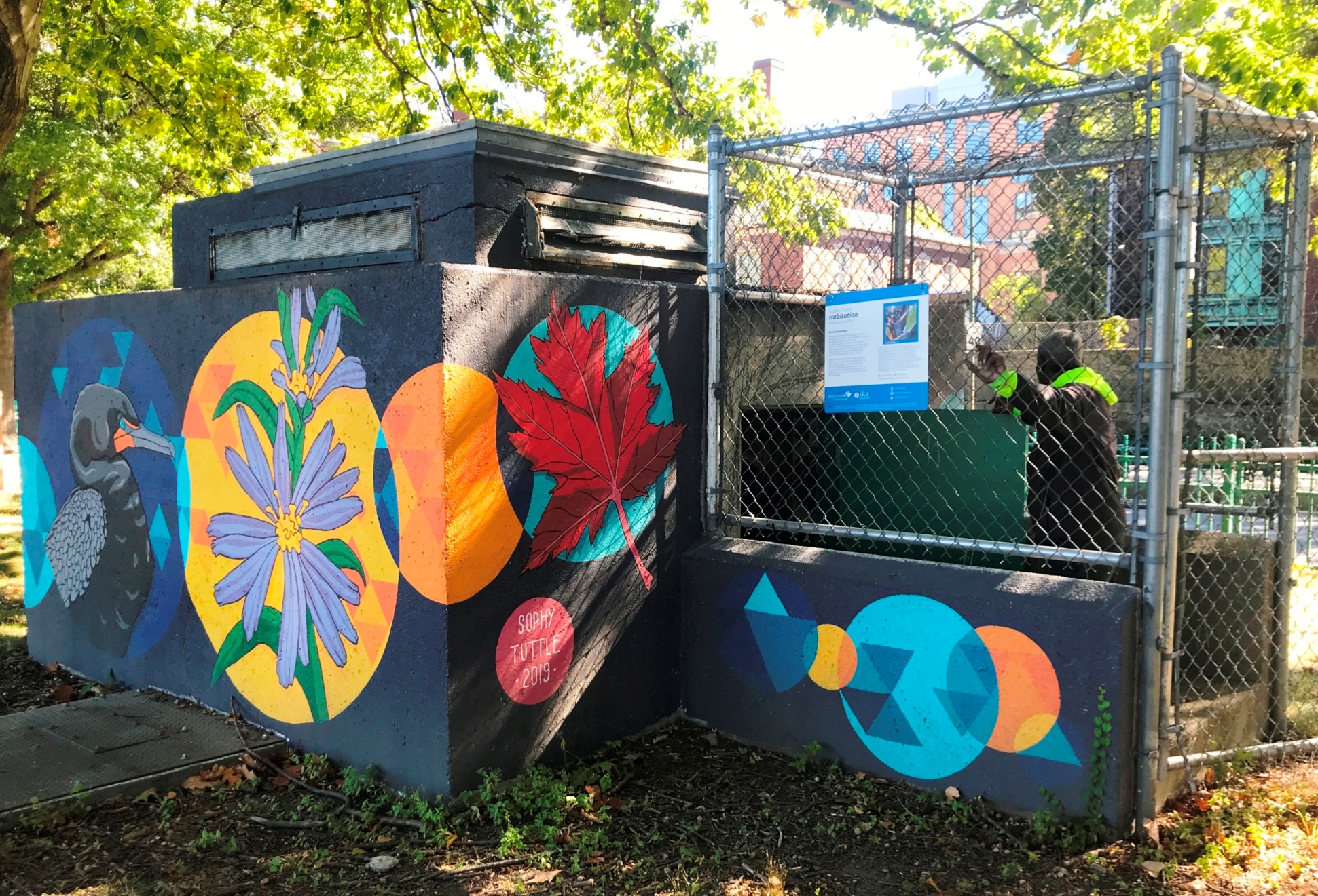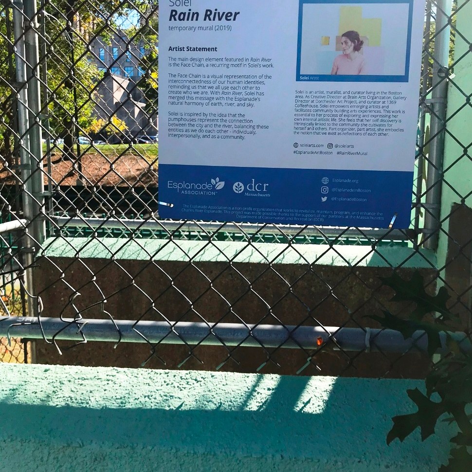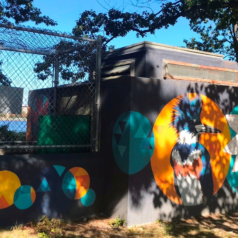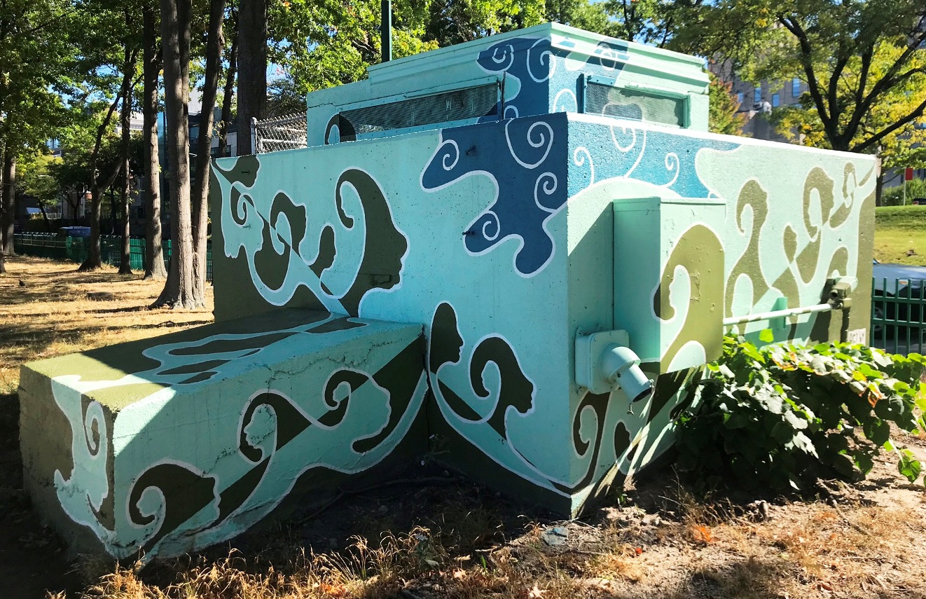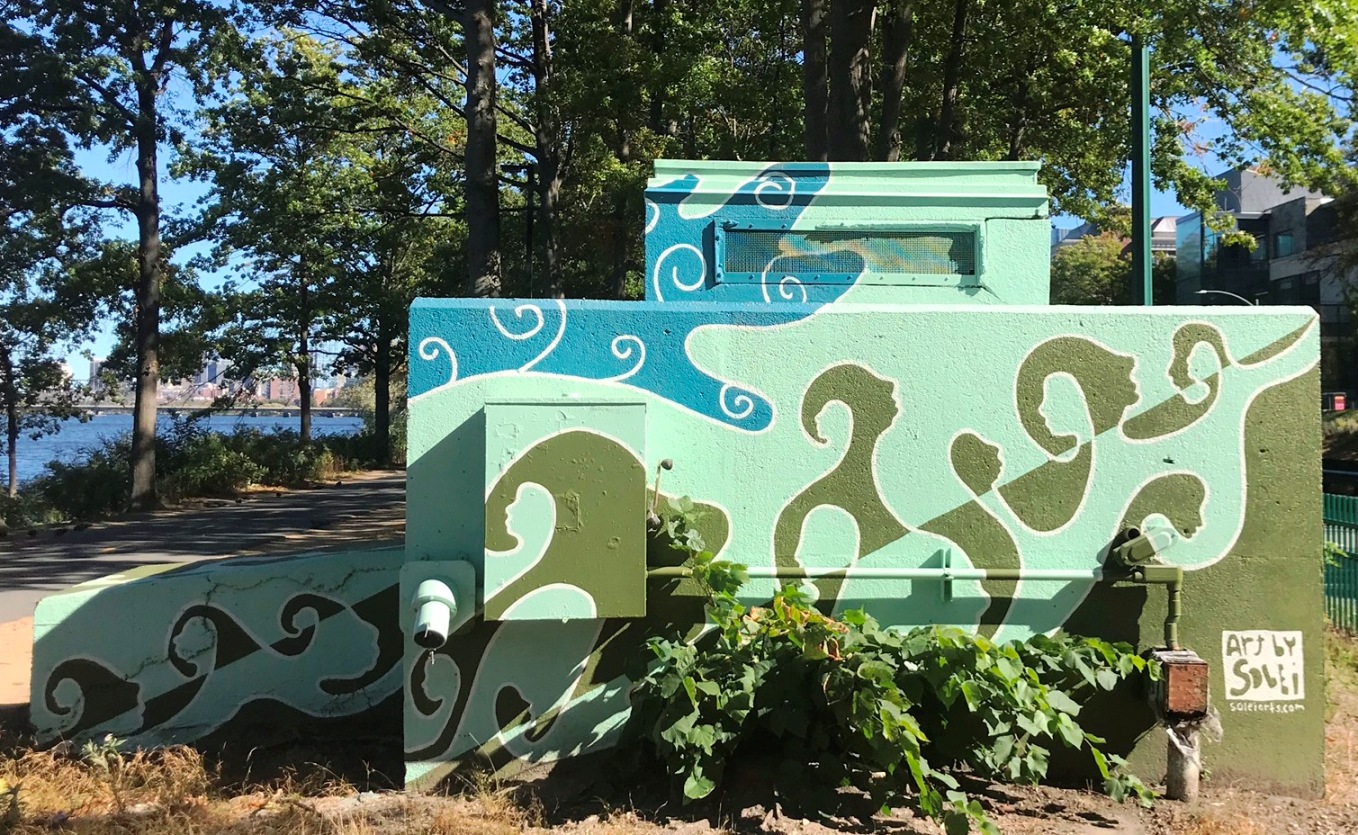 More than a year ago, three artists adorned all sides and surfaces of three different pumphouses on the Esplanade. I had meant to connect and celebrate these accomplishments at that time. Now at the start of a new year, I can do that with additional appreciation of their presence. Though pumphouses along the Charles River have always been essential in regulating water drainage, their cement block structures were neglected and defaced until funds from the Esplanade Association allowed artists to transform their appearances in 2019.
