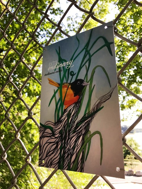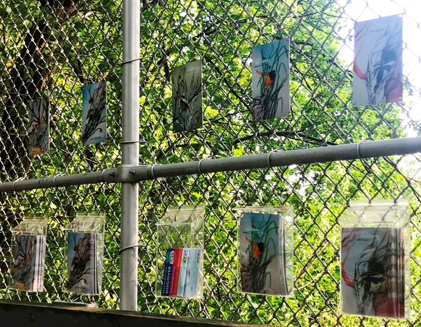Extraordinary Ordinary Bird cards in see-through protective case on chain-link fence near Spy Pond