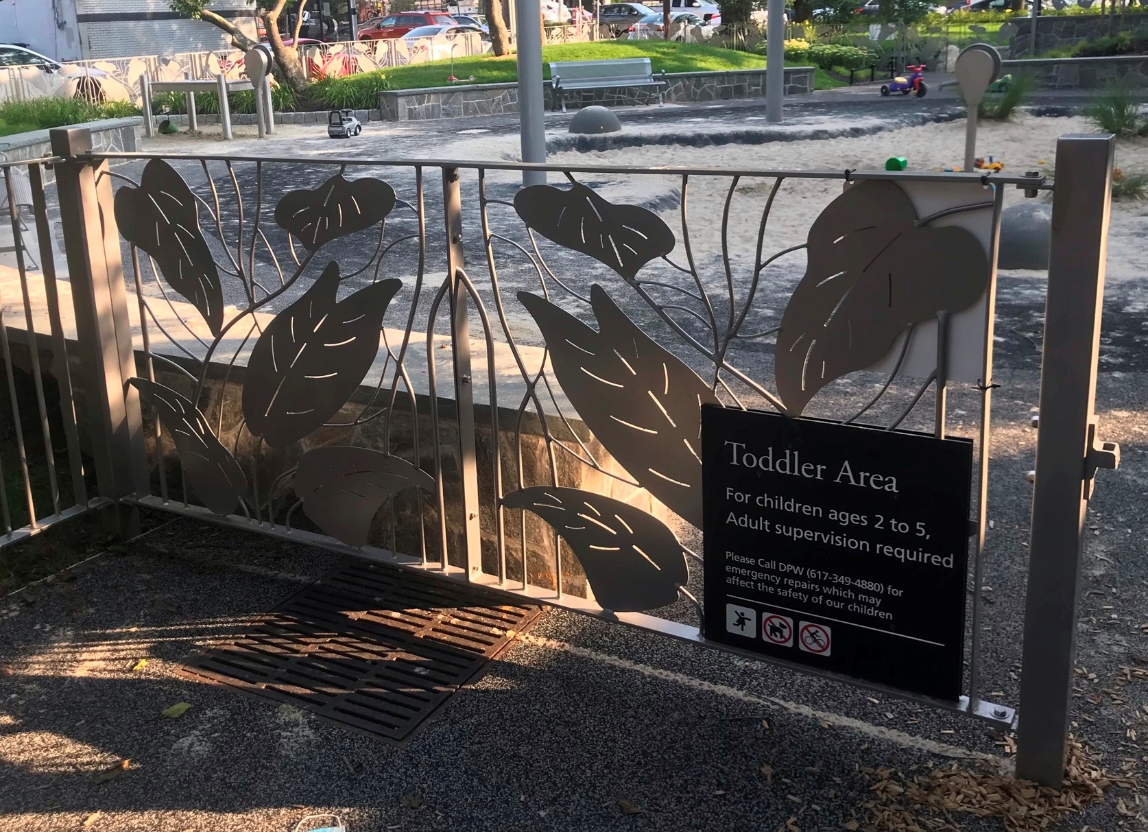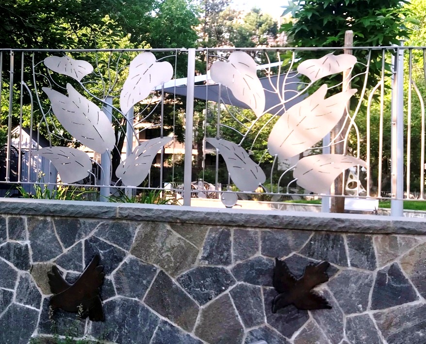 Recently I learned that the renovated park had opened, so I headed there one early evening in July. The bronze birds were back, set against a stone wall that replaced their brick background. Floral plantings enhanced their new setting, with the promising addition of a flowing plant-patterned fence that certainly added to my appreciation of the whole park. I couldn’t find the name or signature of the fence designer in the park or any of the web searches I usually rely on, but at last I came upon the name Bart Uchida!