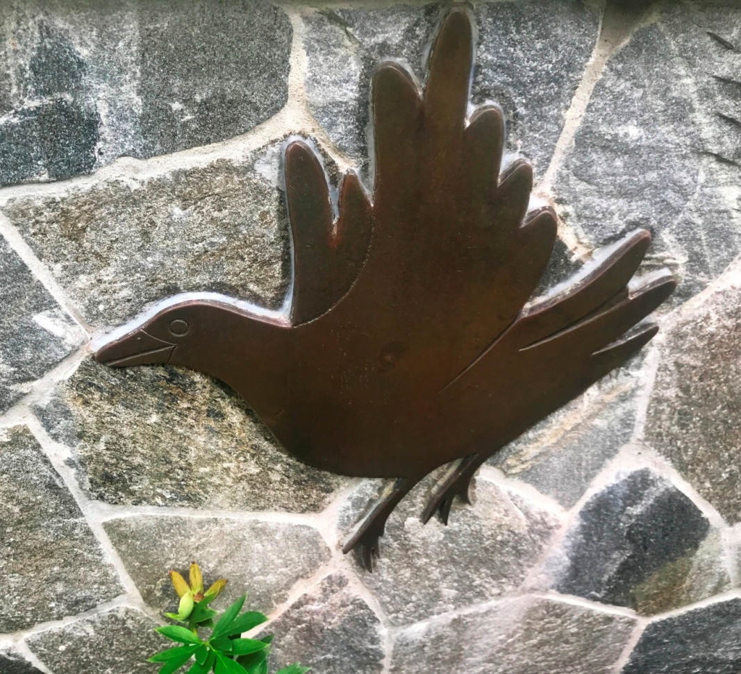 Bronze birds by Juliet Kepes on stone wall below metal fence designed by Bart Uchida, Clarendon Avenue Park, Cambridge, summer 2021: