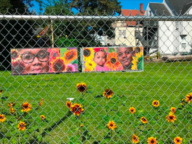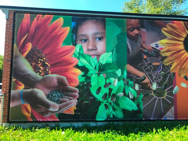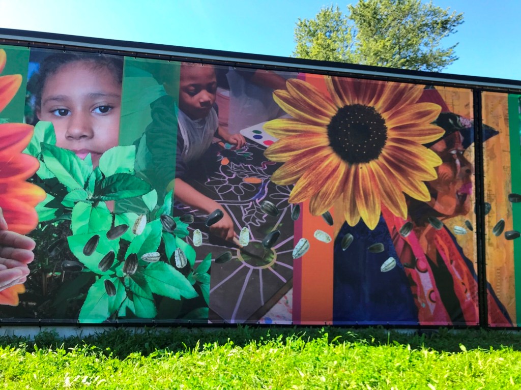 2. Recognize special qualities of temporary art. The mesh murals on the side of the building and on the shipping containers in the nearby field will be gone by early December. The sunflowers in that field will be gone well before that. BUT their seeds will lead to more sunflowers growing there and elsewhere next year. And the murals will be replaced with new murals by another team of artists in the Mentoring Murals project.