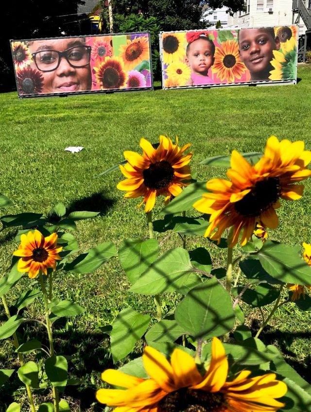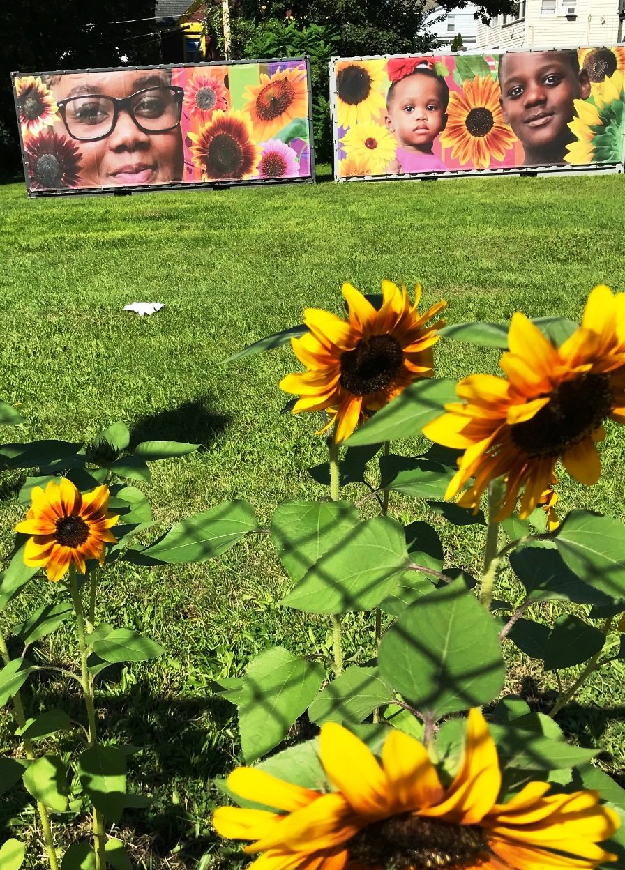 “On a beautiful, sunny September afternoon, Ekua Holmes and London Parker-McWhorter revealed three new murals in Grove Hall. The three works titled “Honoring the past, seeding the future,” magnify the importance of today’s youth for tomorrow’s future. Sunflowers, planted this past spring in bloomed in the lawn alongside, augmented the work’s radiance. “ ( excerpt quote from Now+There; Mentoring Murals )