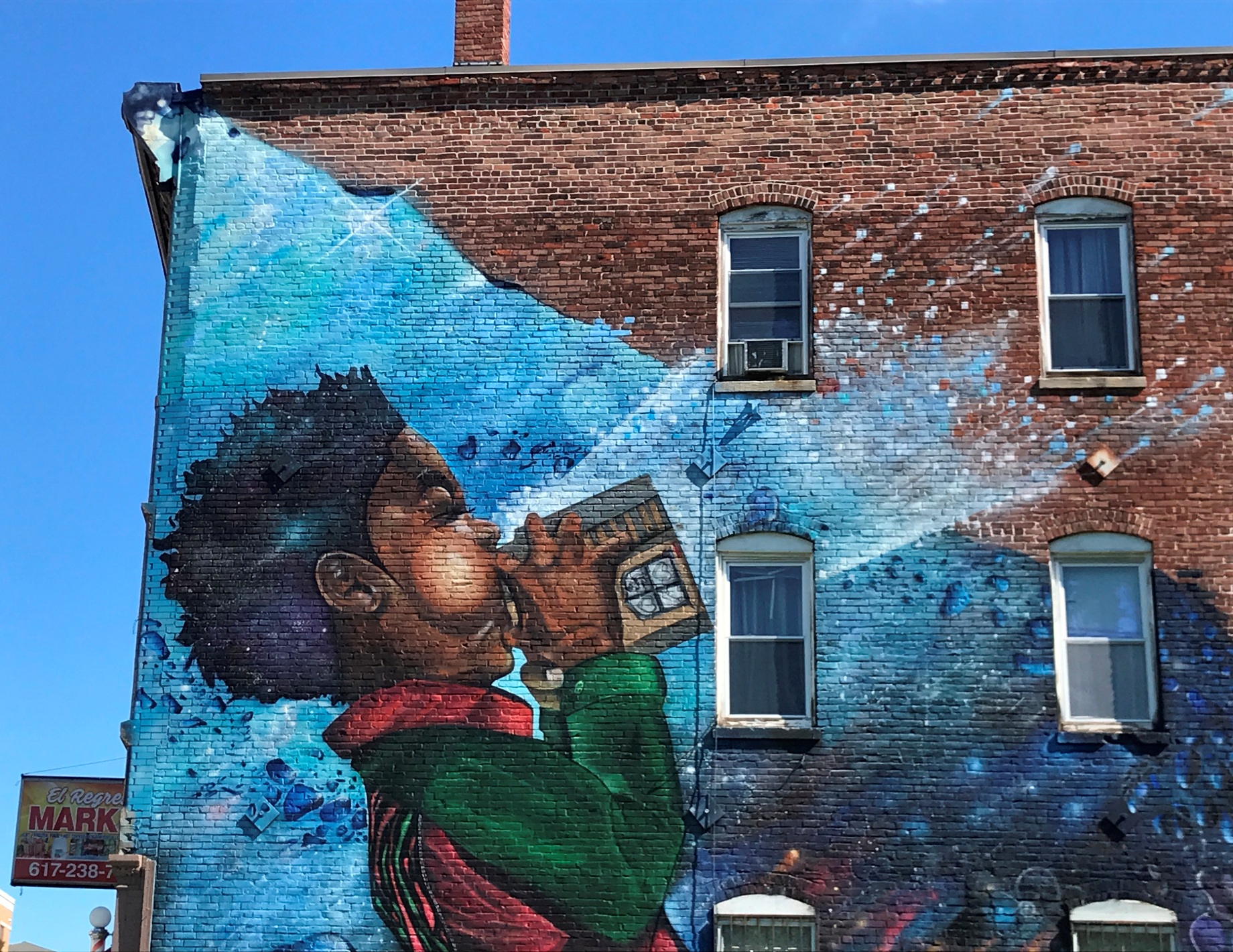 3. Marvel at the mural across the street: “Breathe Life,” created in 2017 by Rob ‘Problak’ Gibbs. See links to more about other murals in his Breathe Life series. Follow the link with a map, photos, and clear information about several other impressive close-by murals in Grove Hall.