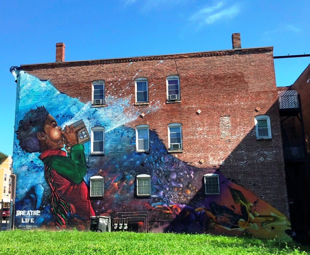 ““Breathe Life 2” is a towering, four-wall depiction of a young Black girl, the same girl who sits on the shoulders of her brother in “Breathe Life 3,” the Roxbury mural Gibbs completed last summer. (The original ”Breathe Life” depicts the boy alone and stands on Blue Hill Ave.)” ( quote from Globe article by Diti Kohli about Rob “Problak” Gibbs’ three Breathe Life murals)