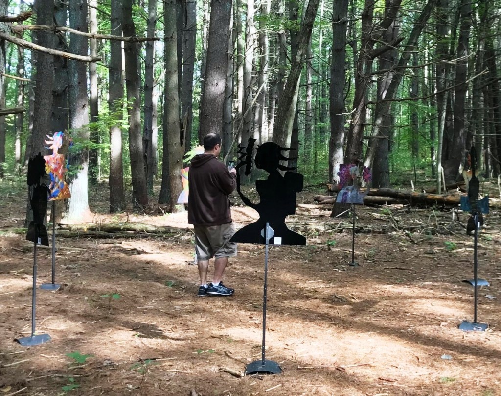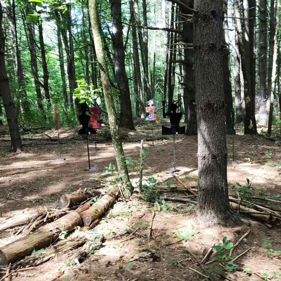 “My artmaking process is full of creative sparks and enigmatic turns, as if there were indeed “something in the air.” This is particularly true for my installation “Forest Air,” in which seven life-size cutout figures stand in a large circle. They are an ensemble, and they’ve been on a fantastic journey together—going from two dimensions to three, from paintings into space and time, and now amidst the towering trees in the cool, fall forest air.”