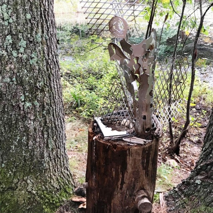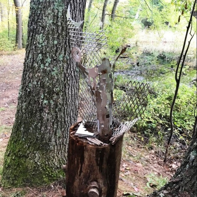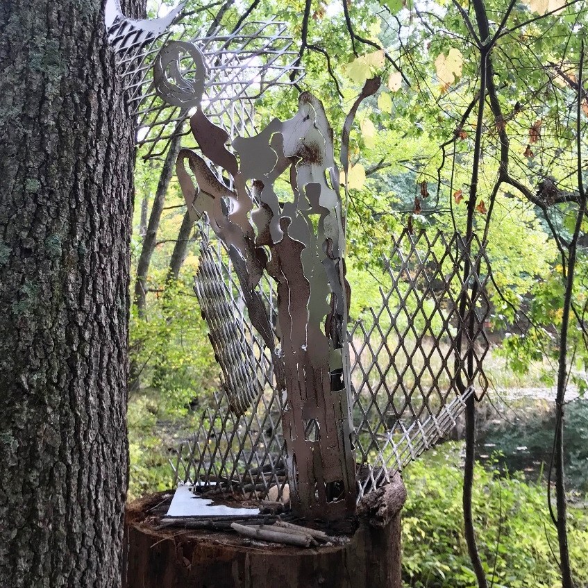 “We need oxygen from trees to survive; without forests humanity ceases to exist. Using the fired cut technique and welding on scraped steel, I created a group of figures that represent humanity and their environment. The negative spaces on the sculpture invite the forest behind to be an active and essential part of the whole sculpture, symbolizing our intrinsic relation as humans with nature.“