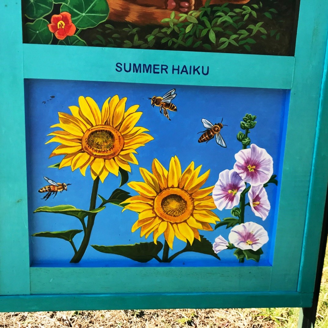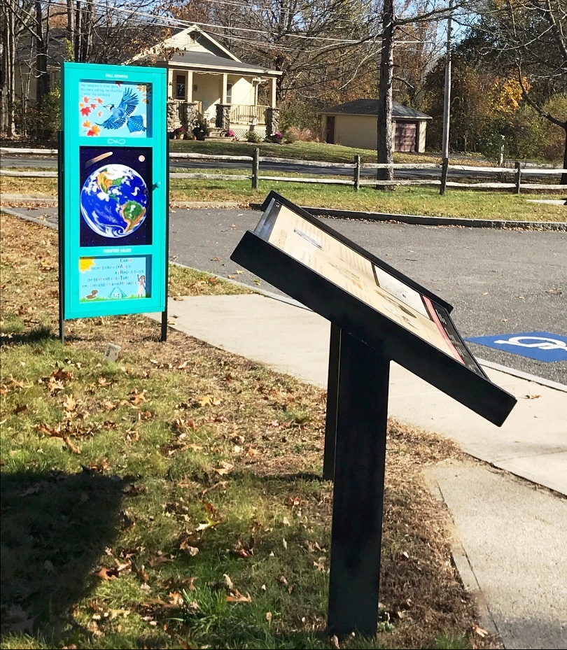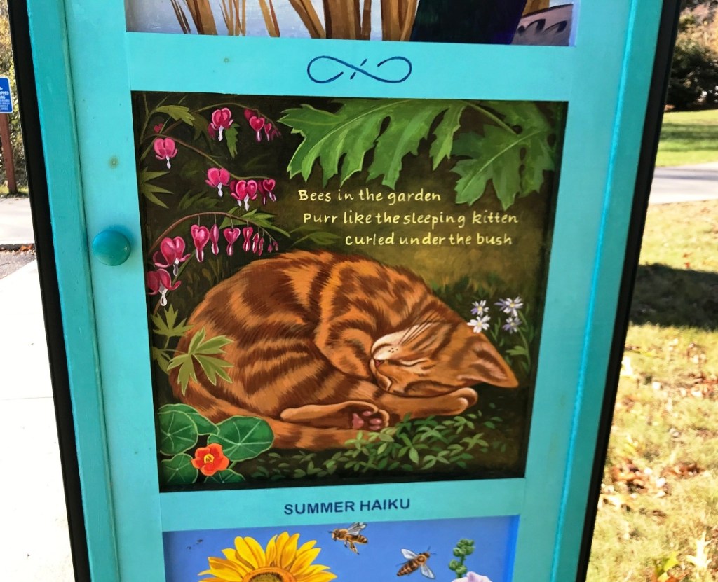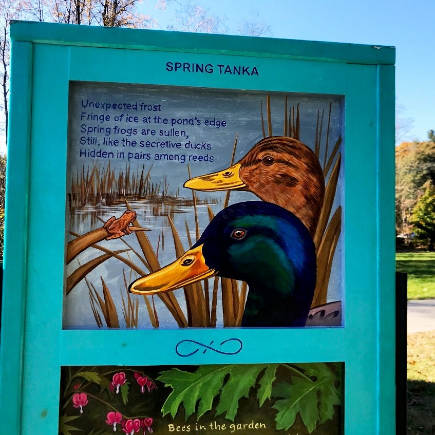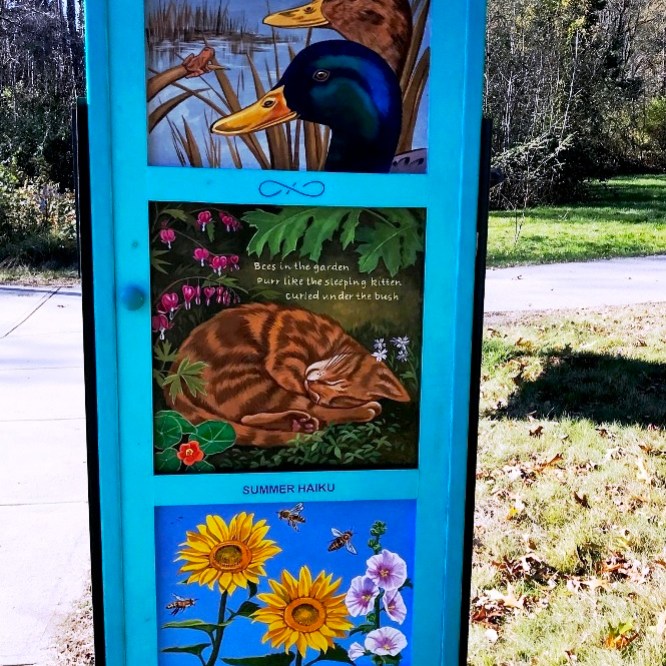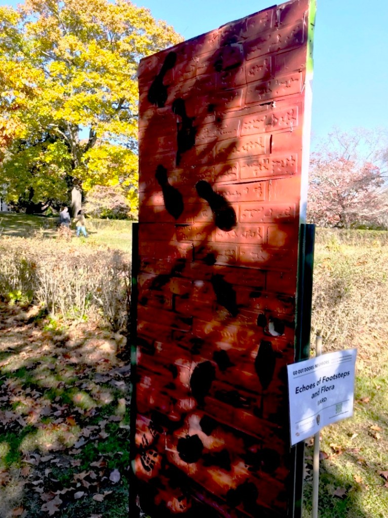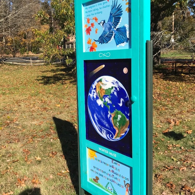 Yetti Frenkel | Go Outdoors! near the parking lot on Hawthorne Lane across from “The Wayside” on Lexington Road, Concord; “When I saw the call for artists to design a door for the Minuteman National Park, I immediately thought of combining words and images to make a poetry door, a portal that would have a quality of whimsy and magic.“( quote excerpt from Umbrella Arts Minute Man National Historical Park Artist Statement)