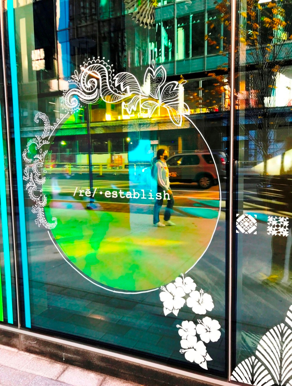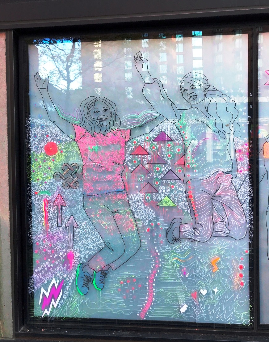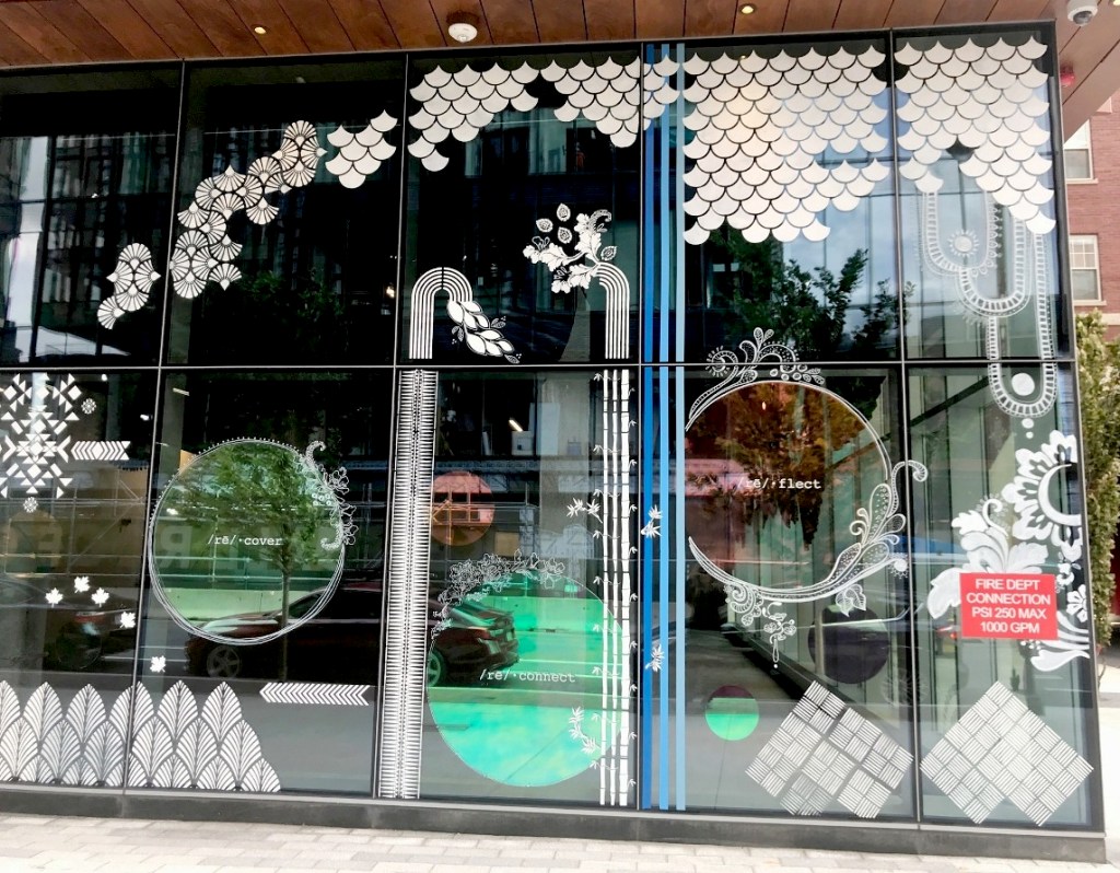 “The mural utilizes acrylic paint, markers, stencils, hanging paper shapes, and dichroic film on glass. It incorporates 16 words using the prefix /rē/, which hope to create connections to meanings relating to the return and emergence of people back into society after a tragic year and serve as a moment to reflect, recognize our similarities, and see themselves as a vital part of this environment.” (quote from artist’s website gallery https://www.silvialopezchavez.com/#/mit-art-activation-kendall-sq-cambridge/ )