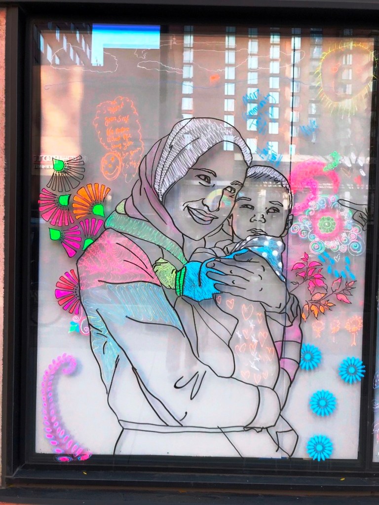 “….a program series at MIT Open Space to engage people and create art at 290 Main St. that incorporates stories, reflections, hardships and hopes of the past year through color, portraits, patterns, and words sourced from community contributions.”( quote from artist’s website gallery https://www.silvialopezchavez.com/#/mit-art-activation-kendall-sq-cambridge/ )