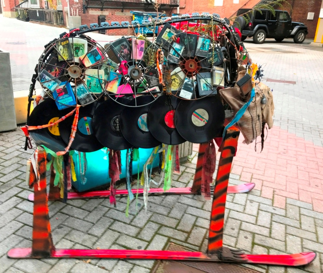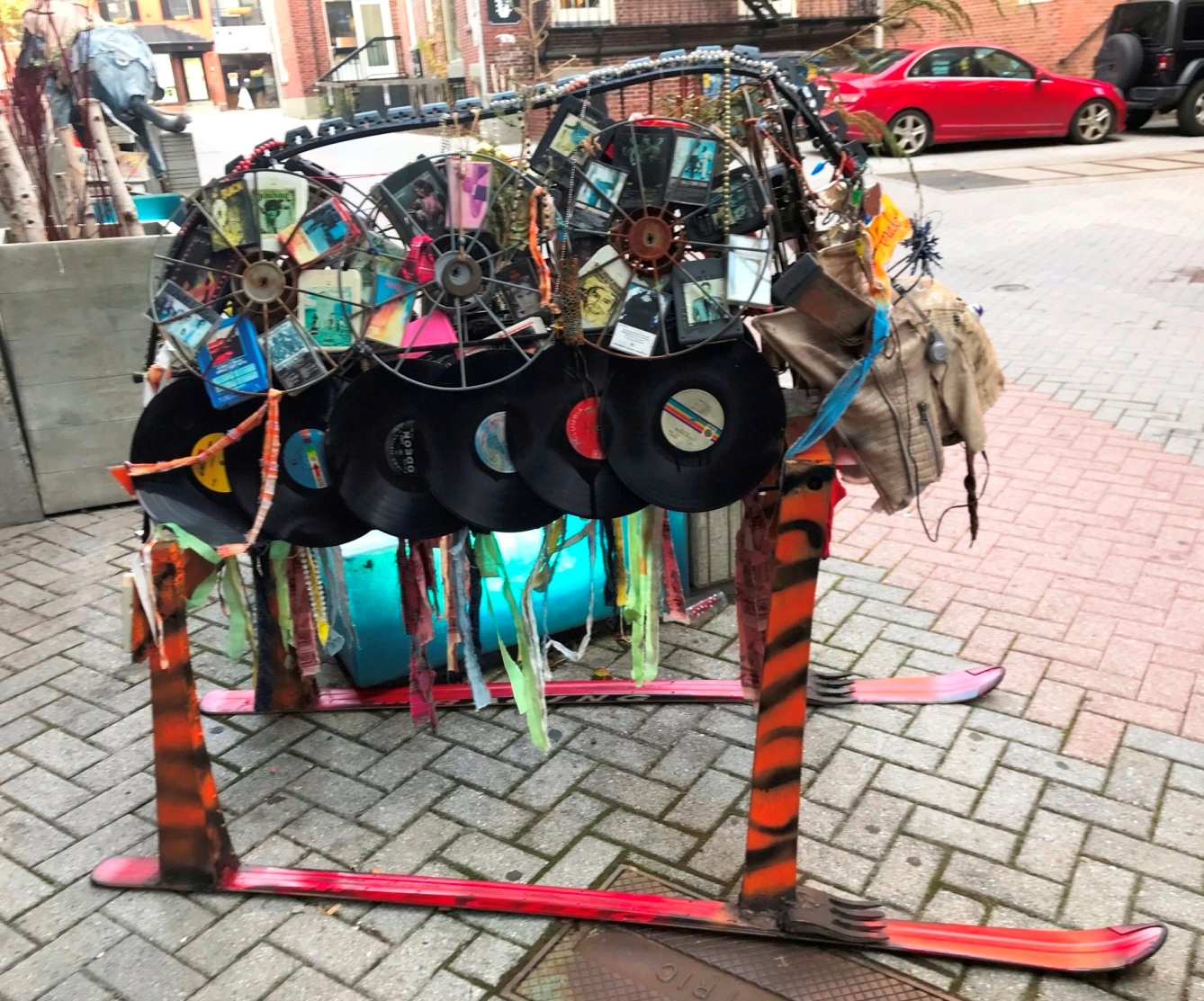 For each of the three Skraelings currently in Palmer Street a colorful sign identifies a significantly named animal. Soundlessly they convey their distinct personalities. Music from the brightly painted piano or from performers at Club Passim (47 Palmer Street) at times enlivens their environment. Patient listeners, they remain on call at all hours. Positioned at social distance, they still seem aware of each other and poised to relate to visitors who want to get to know them. A walk around each one will reveal intriguing details, visible in photos ( below) from different viewpoints.