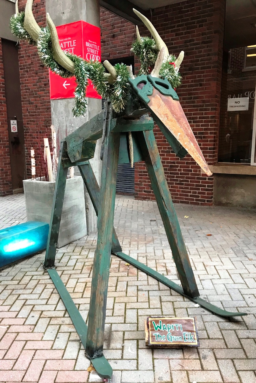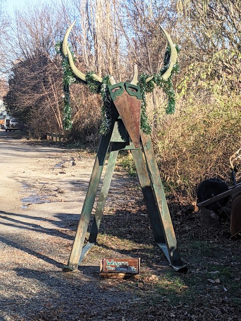 “These being(s) are super heroes that are made from wood, metal, even plastic, all castoff materials from an overly materialistic society. Skraelings fight boredom and apathy in all dimensions of time and space.” ….(They are among)” more than twenty Skraeling sculptures made along the Alewife Brook at Arlington by a collaboration of friend artists, especially Nick Wyneken, who also has many individual works. Our art has no gallery but outside as free Public Art.” ( excerpt quote from Robert Smith, Facebook, Dec 8 ) Both photos in the Alewife Brook location are from Bob Smith: Wapiti the Green Elk and Harley the Wounded Unicorn Bison (left) ;Wapiti the Green Elk ( right)