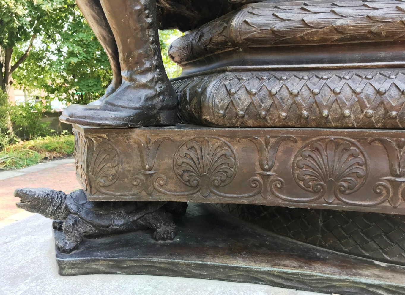 “The base is ornamental with reliefs of fruits, nuts, insects, and birds, commemorating Arlington’s famous market garden economy of the early 20th century. ” (quote excerpt from Walking Tour, Arlington Center, Cyrus Dallin Art Museum, slide 4 )