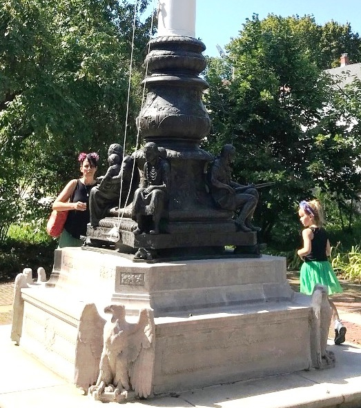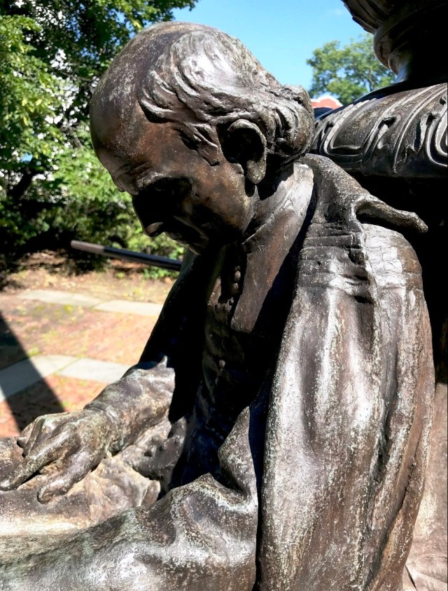 “In 1913, Cyrus Dallin was commissioned by the Robbins family to create the Robbins Memorial Flagstaff to be placed next to the new Town Hall. The figures on the flagstaff represent the town’s early history: Woman Leader of the MassachusettsTribe; a Pilgrim father studying his bible; a mother teaching her child to read; and a Minuteman on guard with his musket.” (quote excerpt from Walking Tour, Arlington Center, Cyrus Dallin Art Museum, slide 4 )