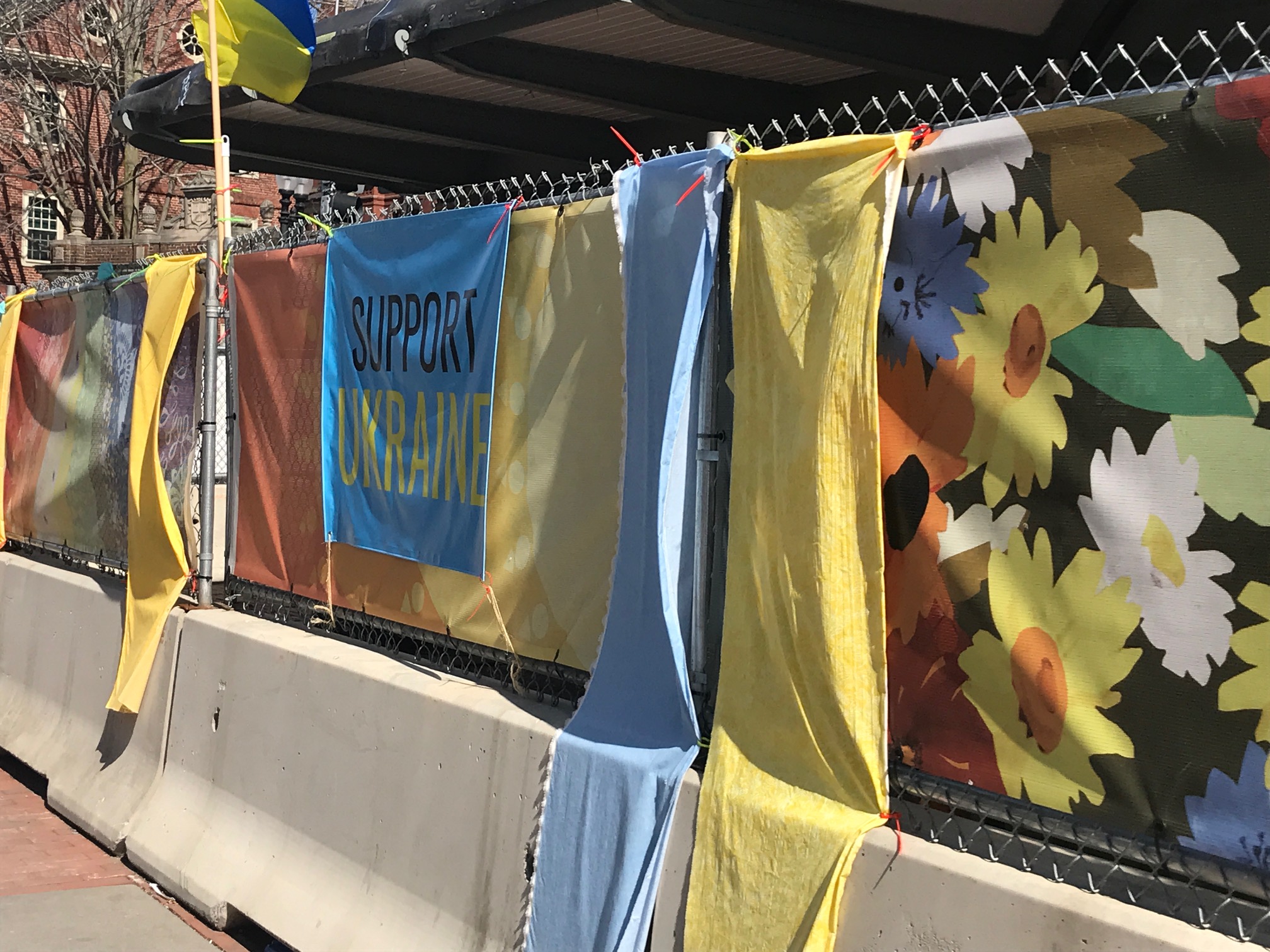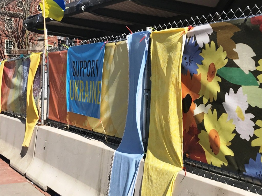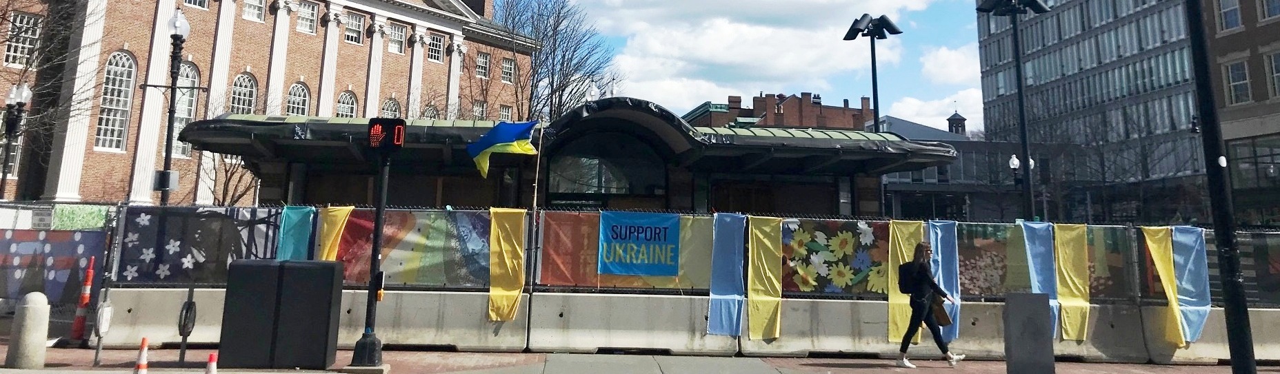Ukraine’s Colors Draped along Patricia Thaxton’s Mural around T-stop Kiosk, March 2022
