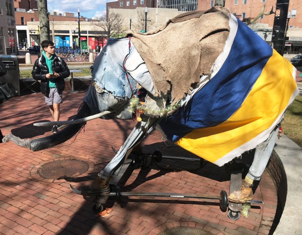 “The statue of abolitionist senator Charles Sumner in Harvard Square, wrapped by artists Ross Miller and Yolanda He Yang to echo the sight of statues in Lviv, Ukraine, where statues have been wrapped in plastic and fireproof materials to protect them from war damage…… The artwork, “Ukraine Echo,” brings awareness to one of the great horrors of war: the destruction of culture. “( quotes from WBUR local coverage/arts and culture, March 25, 2022)