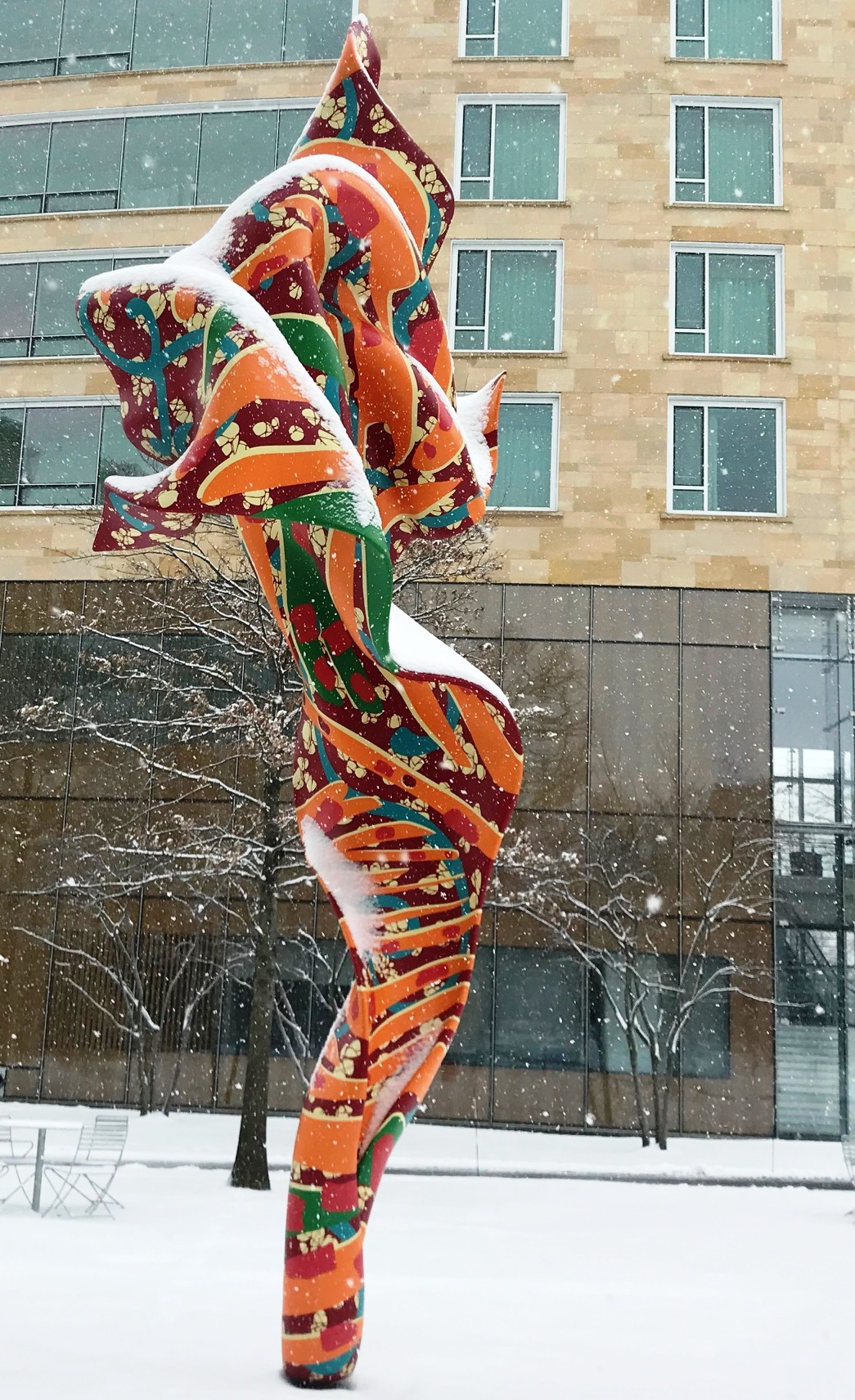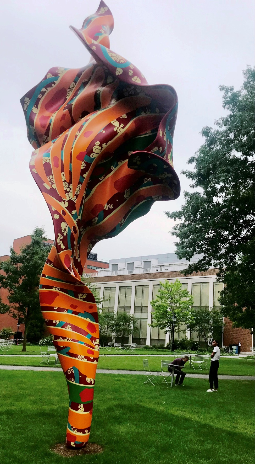 “Wind Sculpture (SG) V was acquired by Harvard Business School in 2021 for the C. Ludens Ringnes Sculpture Collection. In this work, Shonibare employs Dutch wax textiles to visualize the idea of capturing the volume of wind. Constructed of industrial materials, the monumental, hand-painted 22-foot-high sculpture is based on photographs of wind being blown into the actual batik fabrics. Shonibare has expressed his aim with the Wind Sculpture series: “I wanted to defy gravity. To do something that actually looks soft, but it’s made out of hard materials, like fiberglass and metal.”’ “( quote from Harvard Business School Newsroom , Sept 22, 2021)