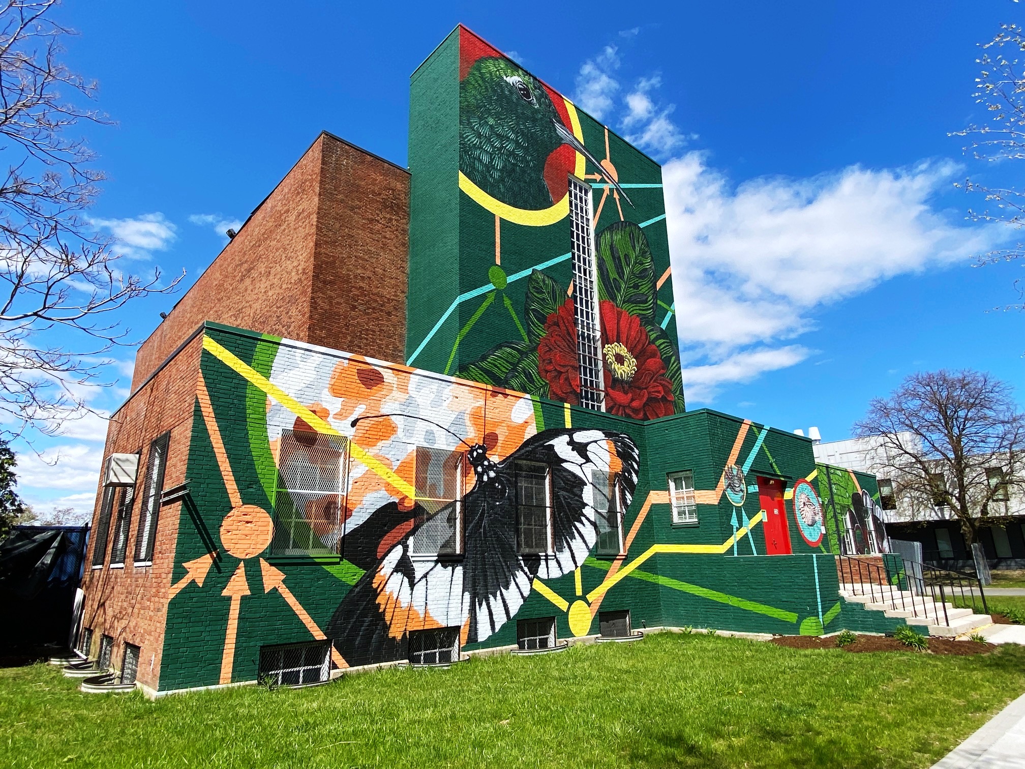 ““Interconnected” is a joyful reminder that we—humans, hummingbirds, succulents, butterflies and all of our fellow creatures—are all deeply dependent on each other. It is painted on a building erected at the turn of the century to house the New England Deposit Library, which once held the overflow of research materials from both Harvard and other research collections around the region. “ ( quote from Artist Statement by Sophy Tuttle, Interconnected, Zone 3 )