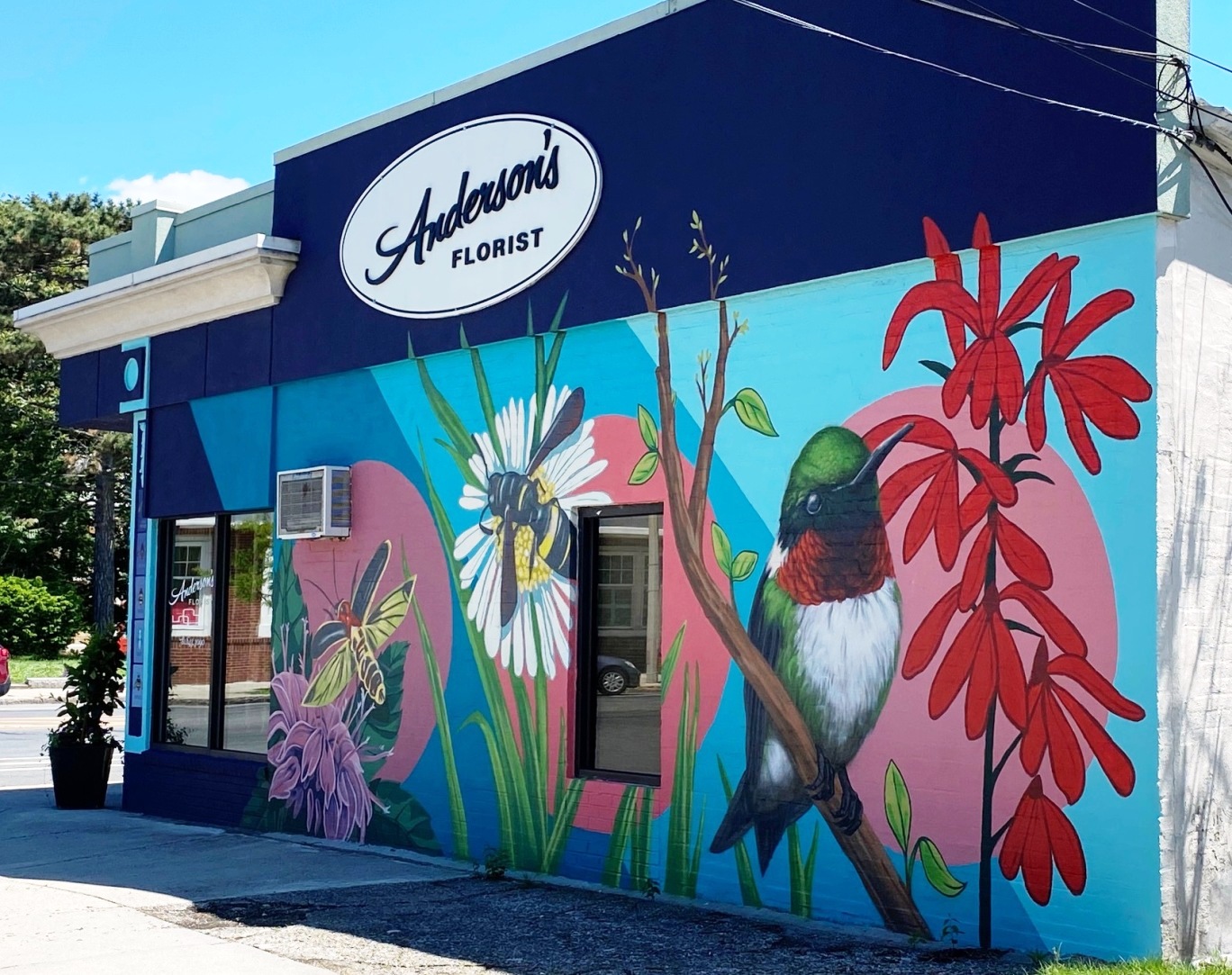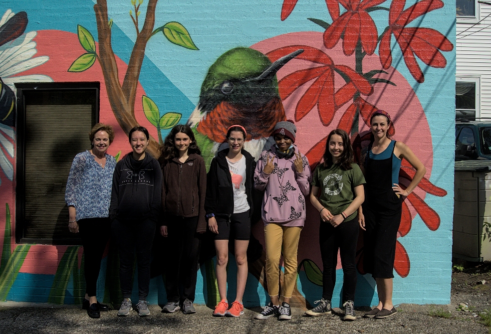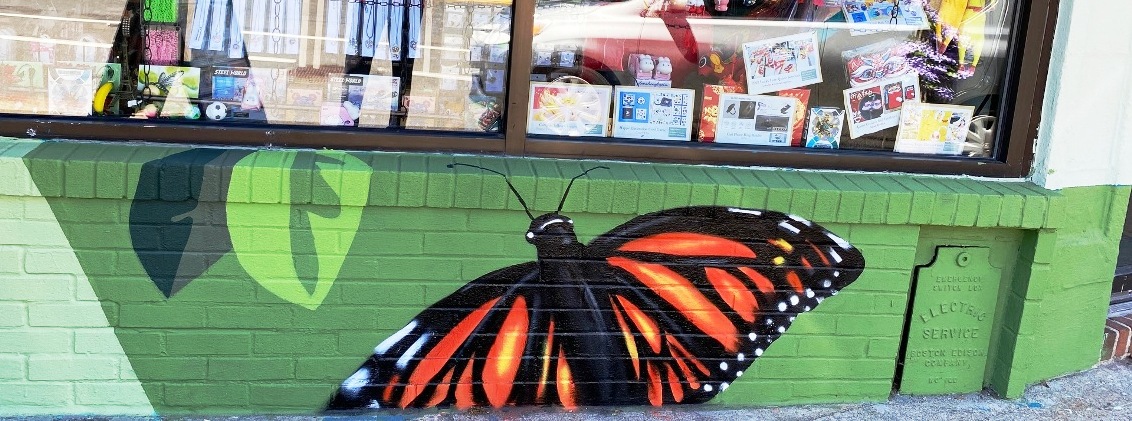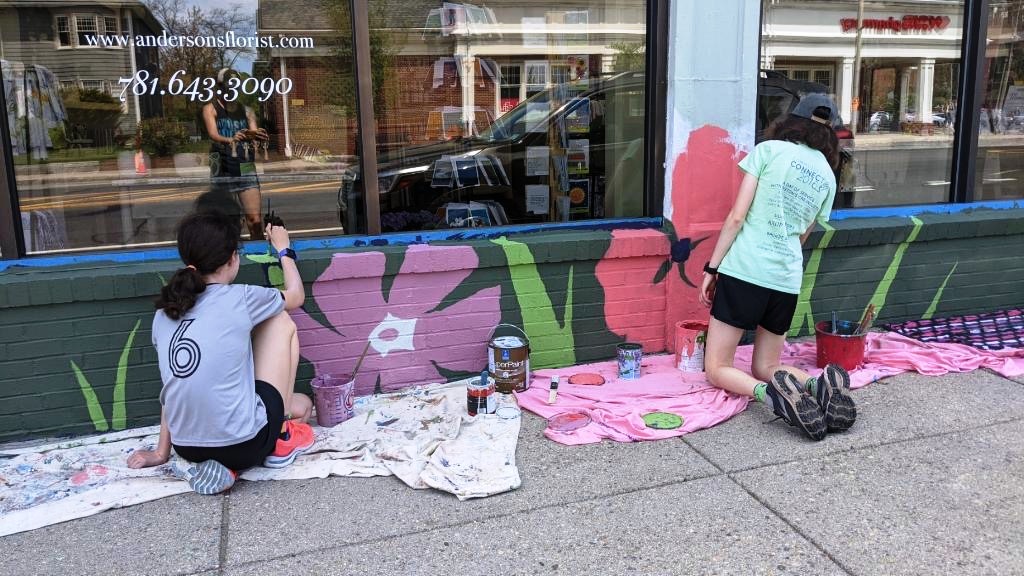 “Artist Sophy Tuttle uses her amazing murals to advocate for wildlife and the natural world, so she was delighted to work with Climate Futures/Arlington interns to create a vibrant mural celebrating the beauty and importance of local plants and pollinators. Interns Juliette BennettGreta MastroJulia McNeillClara Schneider, and Daisy Takang — all students at Arlington High School — painted alongside Sophy for several weekends.” (quote from Arts Arlington Newsletter Mid May 2022 )