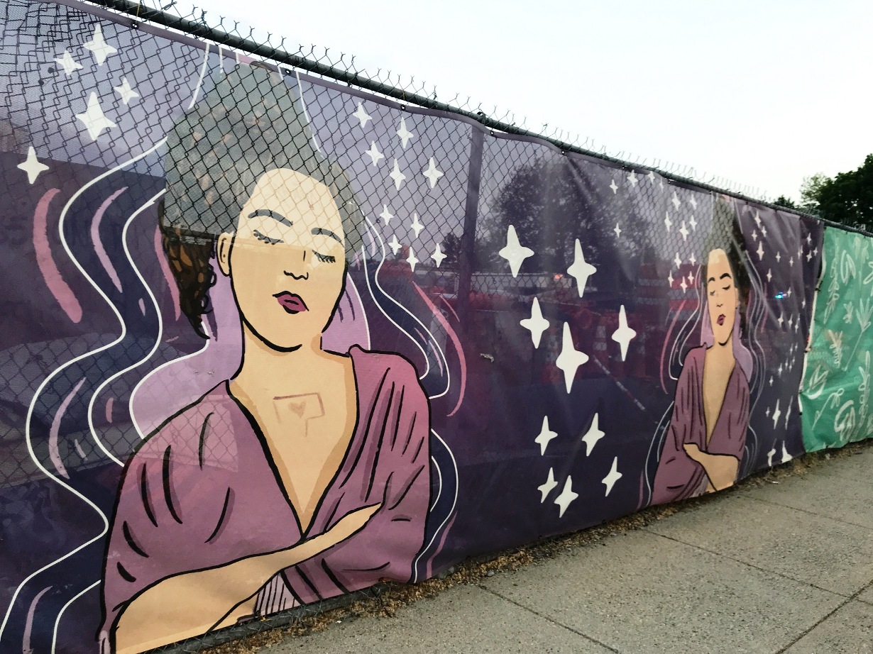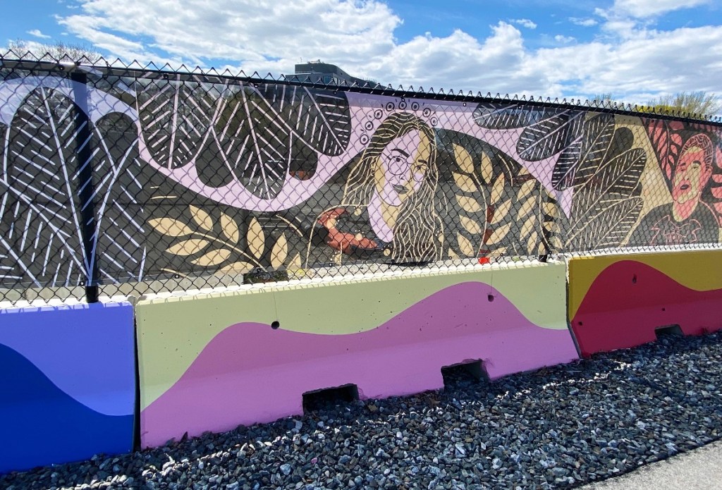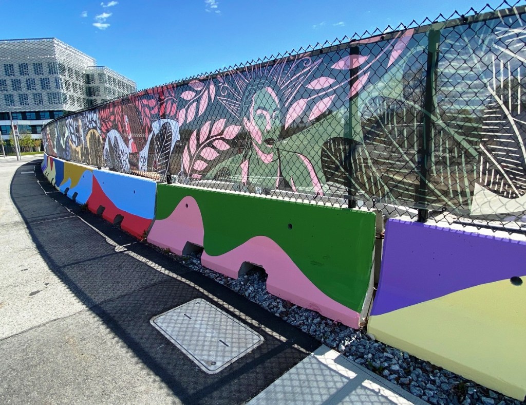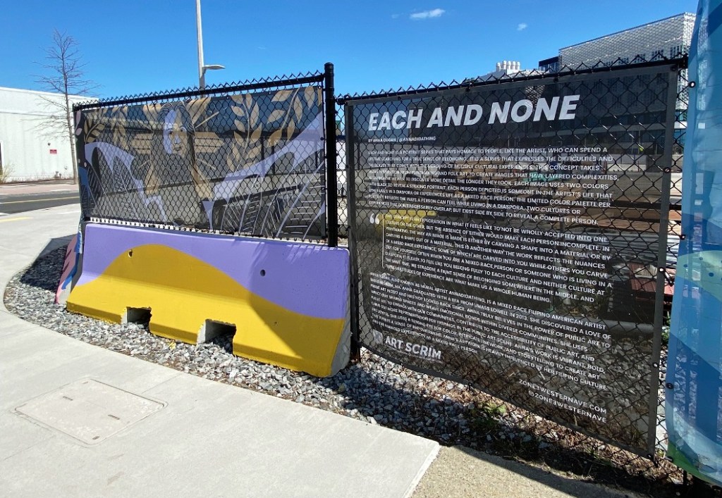 Each and None is a portrait series covering both the fence and jersey barriers below, that takes visual inspiration from printmaking and folk art to express the difficulty and beauty that comes with the merge of varied cultural experiences. Anna Dugan, is a mixed race Filipino American artist based in Salem, MA whose work is heavily influenced by her Filipino culture and the nuanced experiences as a mixed race person.” (quote from ZONE 3 : Programs: Art Scrim)