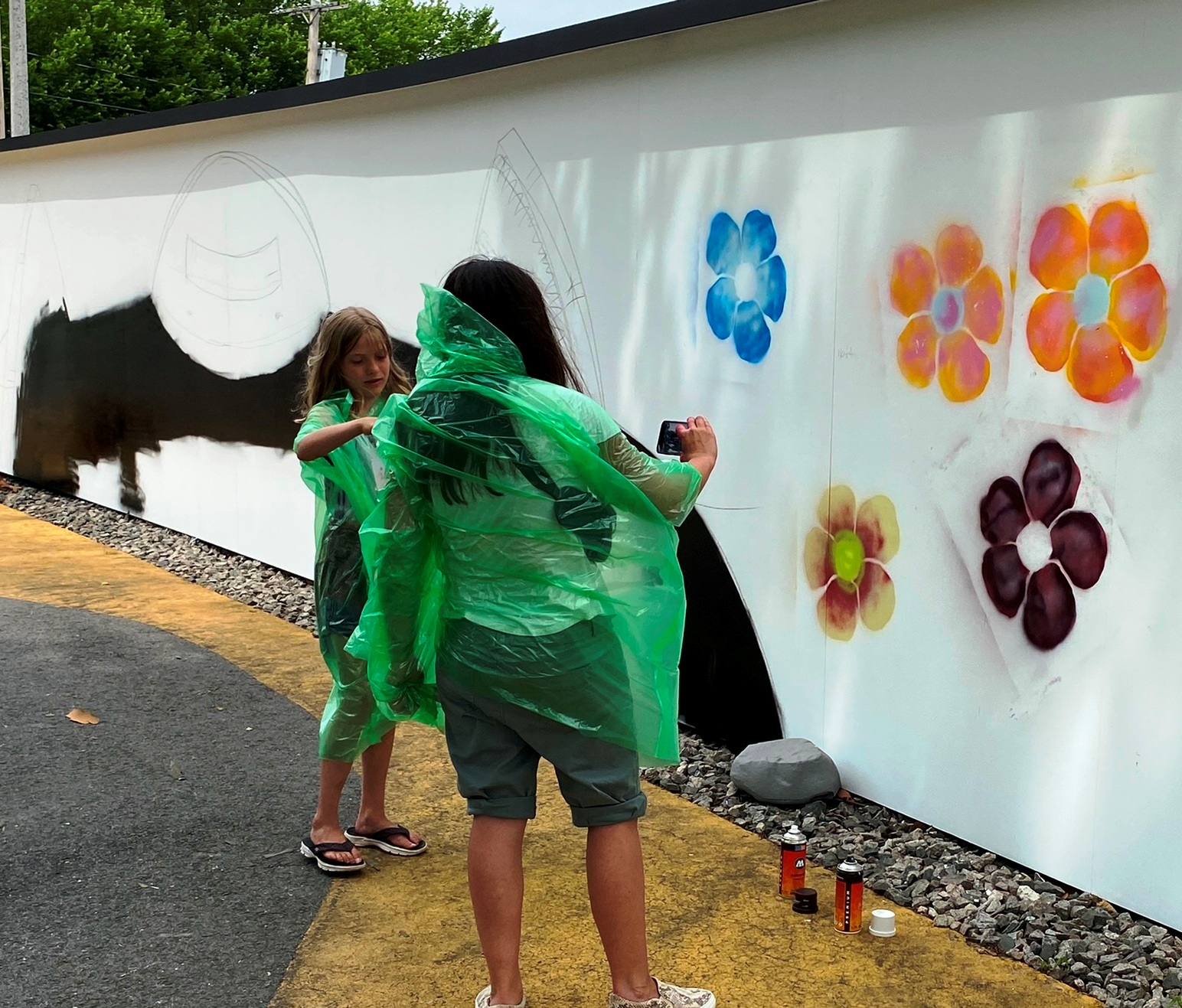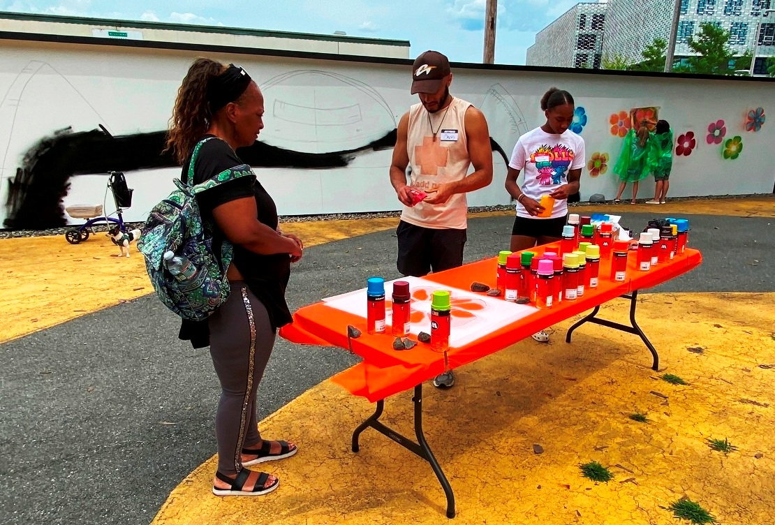“Techni’s signature robots serve as protectors and an outlet to tell stories of being a modern human juxtaposed with the organic flower figures surrounding it. In this workshop the artist will paint a giant robot bust to ground the wall mural. Visitors will get to work alongside Techni to plant (paint) the flowers using a variation of stencils and colored spray paint.” (quote from Zone 3 Community Sketchbook description of events, July 16)