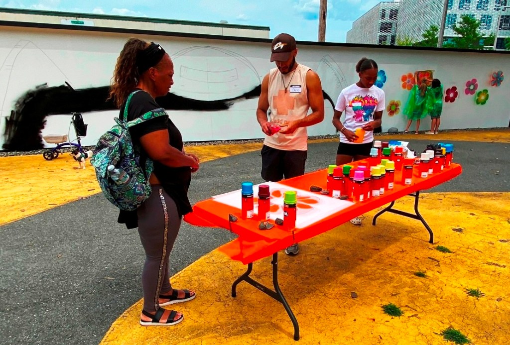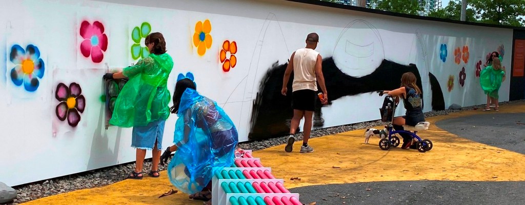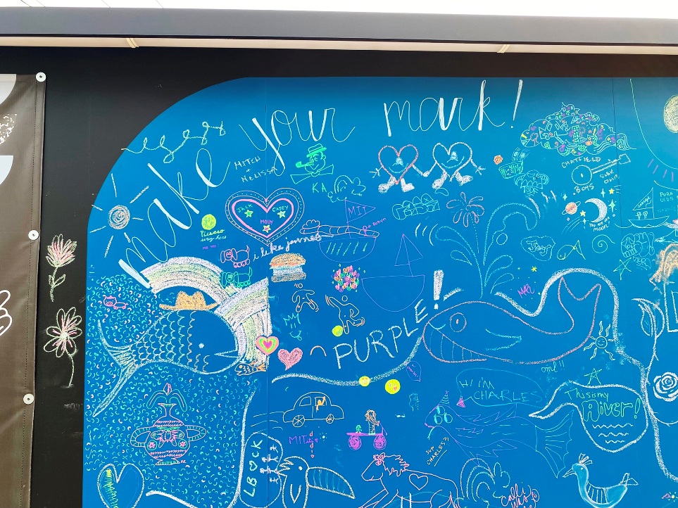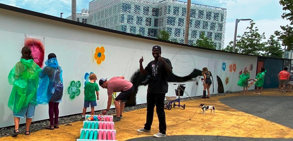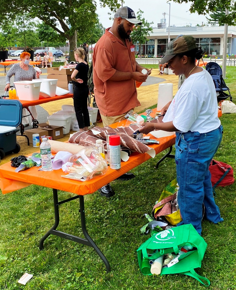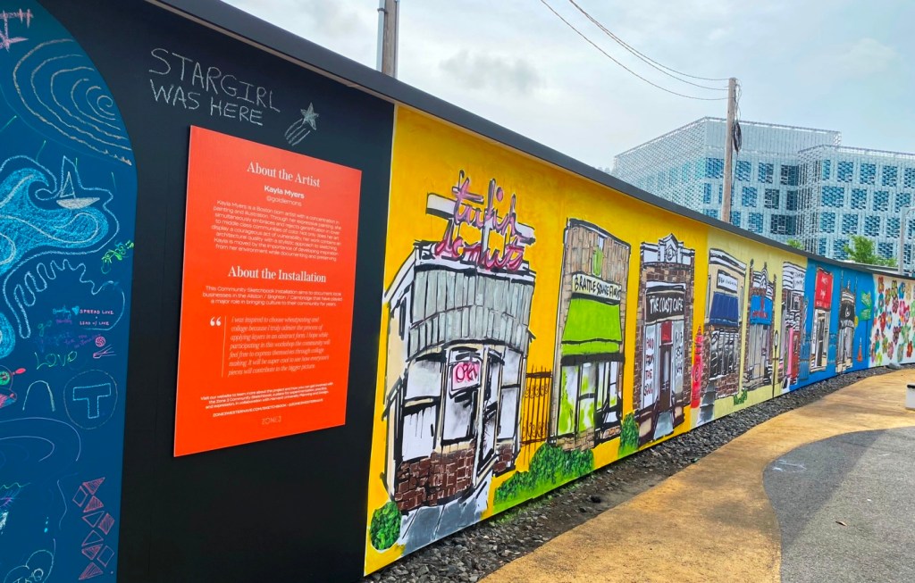 “Kicking off with a full day event on Saturday, July 16, Boston-area artists Kayla Myers (aka GOLDLEMONS) and Christian Rodriguez (aka TECHNI), will lead the community through a number of hands-on art making activities that will contribute to two 100ft large-scale projects, aiming to keep the publicly accessible green space bright and active all summer long. “(quote from Zone 3 Community Sketchbook description of events, July 16)