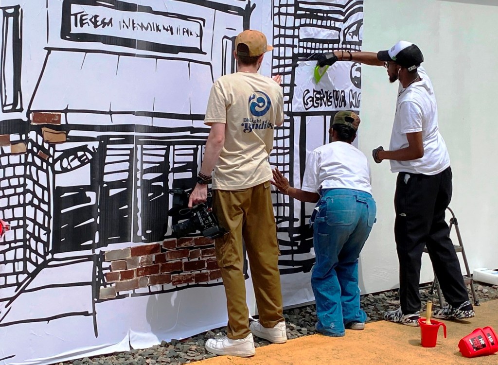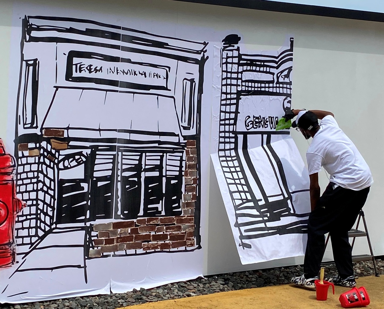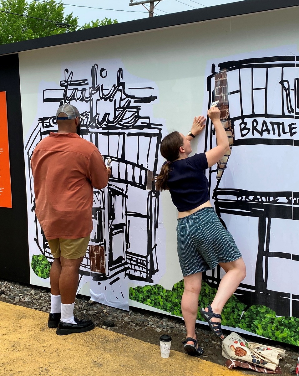 “During this workshop, people will learn about the proper technique and process of wheatpasting. Kayla will print large-scale drawn illustrations of iconic area buildings. Individuals will work together to apply buildings to the wall. Once dry, the buildings will become the base for a community collage. Participants will be invited to embellish the streetscape with collage, paint, and more.” (quote from Zone 3 Community Sketchbook description of events, July 16)
