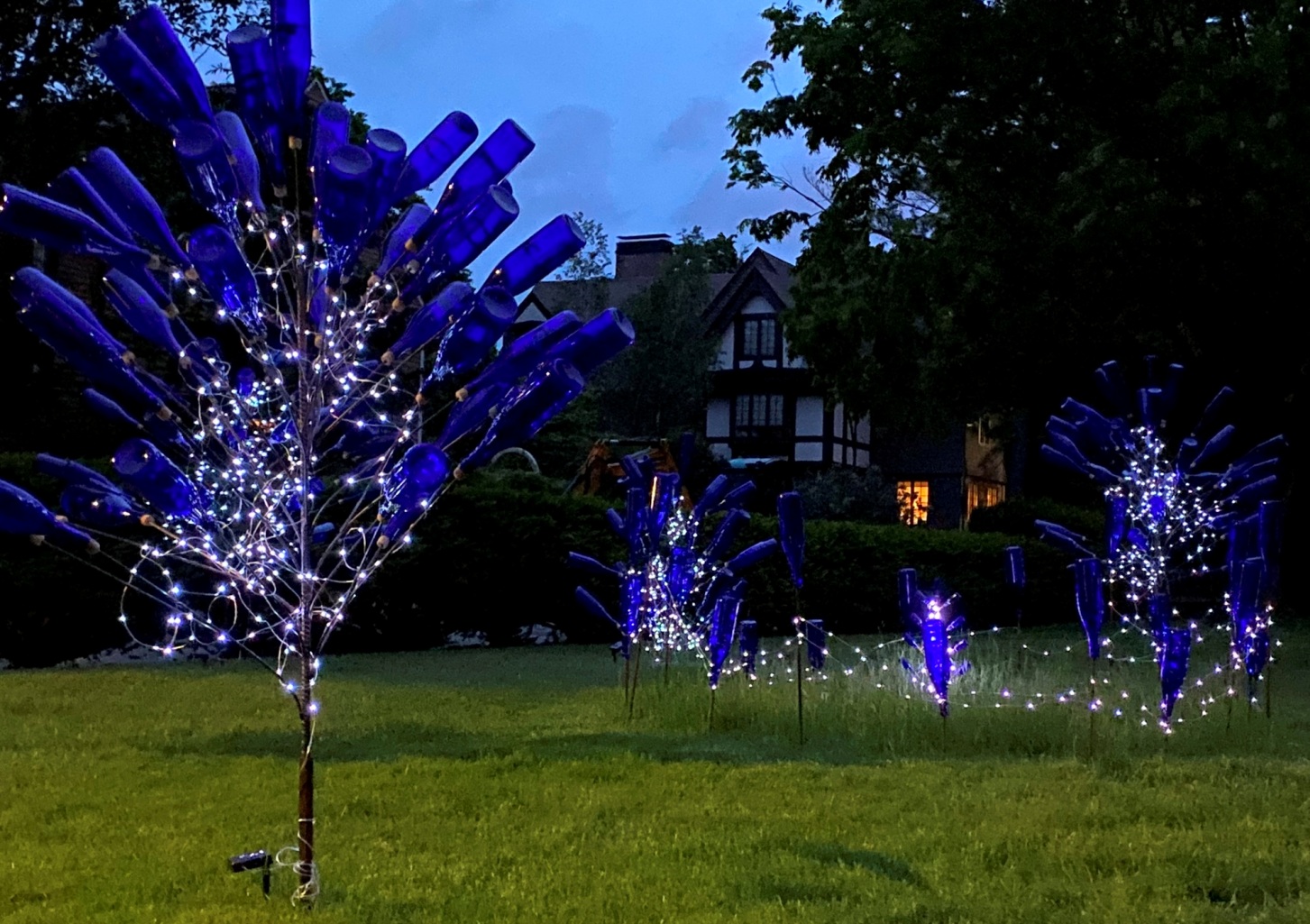 The iron trees’ limbs are capped with 300 indigo glass bottles that are illuminated by solar-powered lights at dusk. (quote from:‘The ugly can turn into beauty’: Bottle trees on Brattle Street hold memory of the enslaved’Boston Globe article by Alexander Thompson, July 17, 2022)