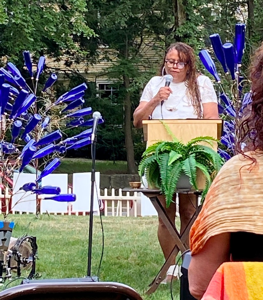 Several times this summer I have viewed and visited the bottle trees on the History Cambridge lawn. I hope to keep revisiting till they’re gone in April 2023. For now, I’ll share photos, quotes, and links that can help us appreciate, understand, and reflect on this enlightening project,“Forgotten Souls of Tory Row: Remembering the Enslaved People of Brattle Street.”