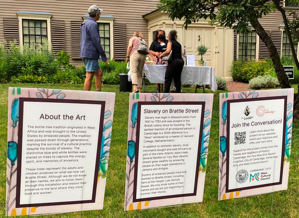 “This summer’s installation by Black Coral, Inc. is a collection of bottle trees. Originating in West Africa, the bottle tree tradition was brought to the United States by enslaved people, most notably those who lived in Georgia and South Carolina. This tradition was passed down through generations of enslaved and, later, free Black communities, marking the survival of a cultural practice despite the bonds of slavery. The distinctive blue and white bottles were placed on tree limbs to capture the energy, spirit, and memories of ancestors.” ( quote from “Forgotten Souls of Tory Row: Remembering the Enslaved People of Brattle Street” June 2022 – April 2023, History Cambridge)