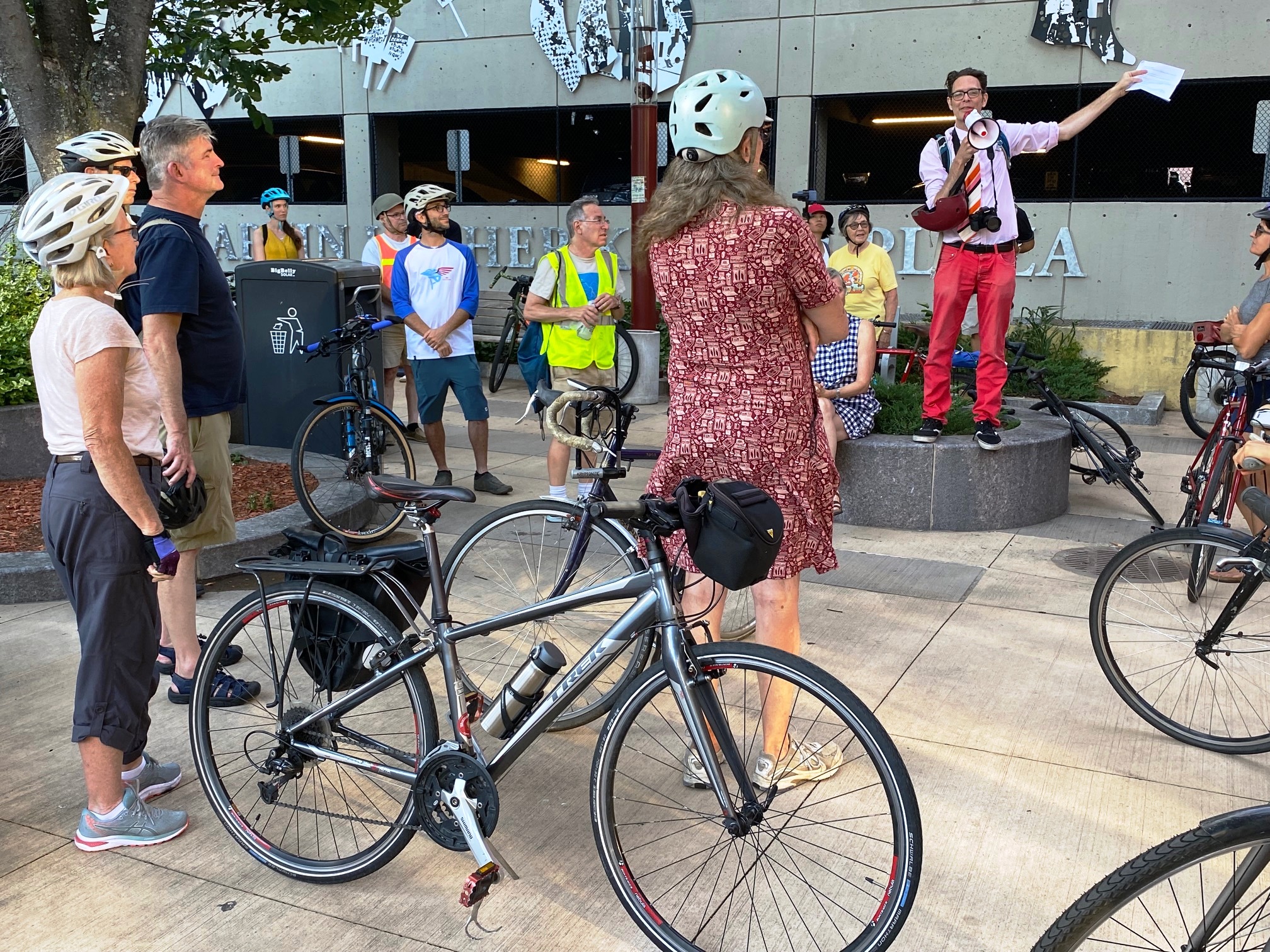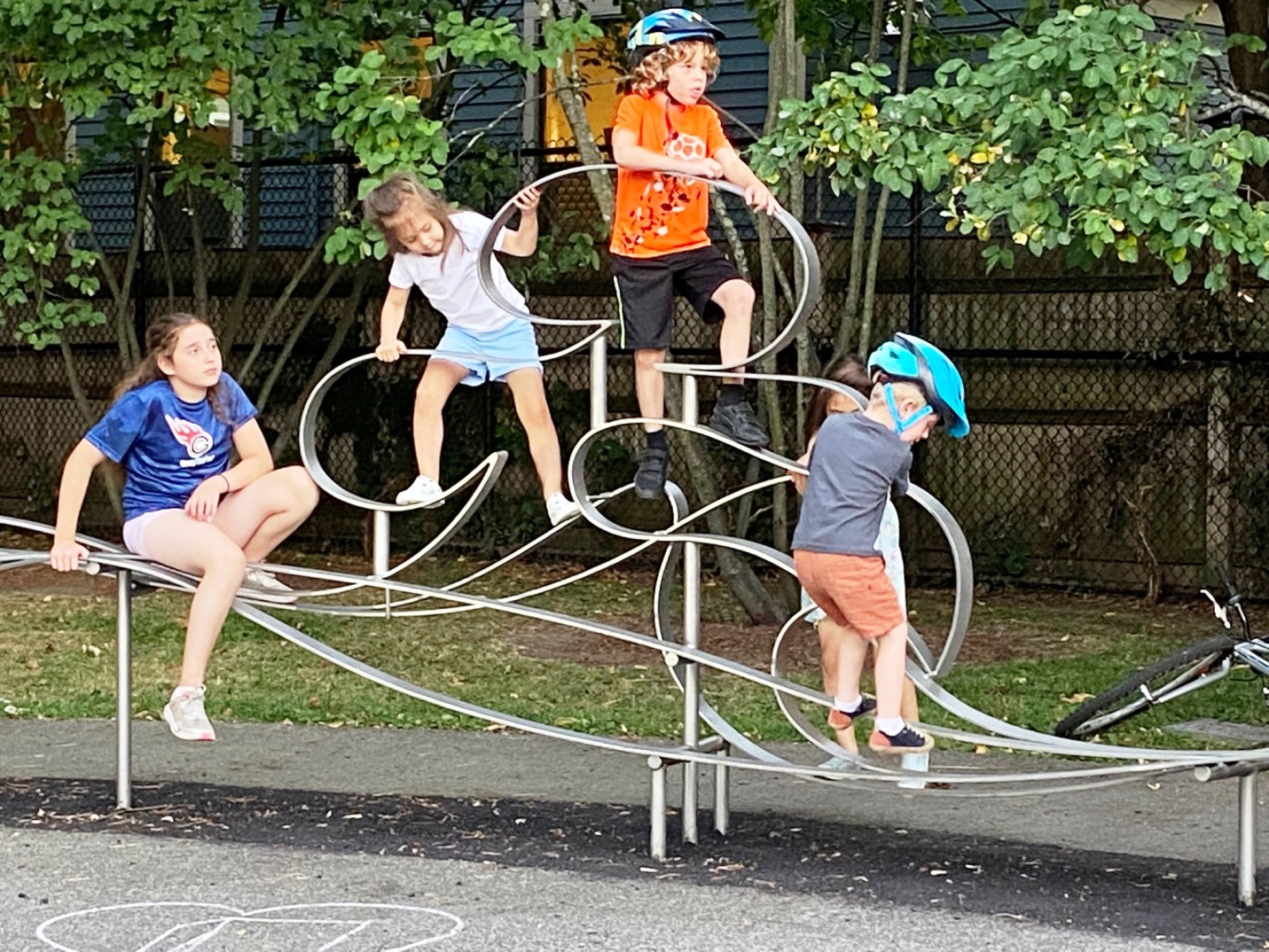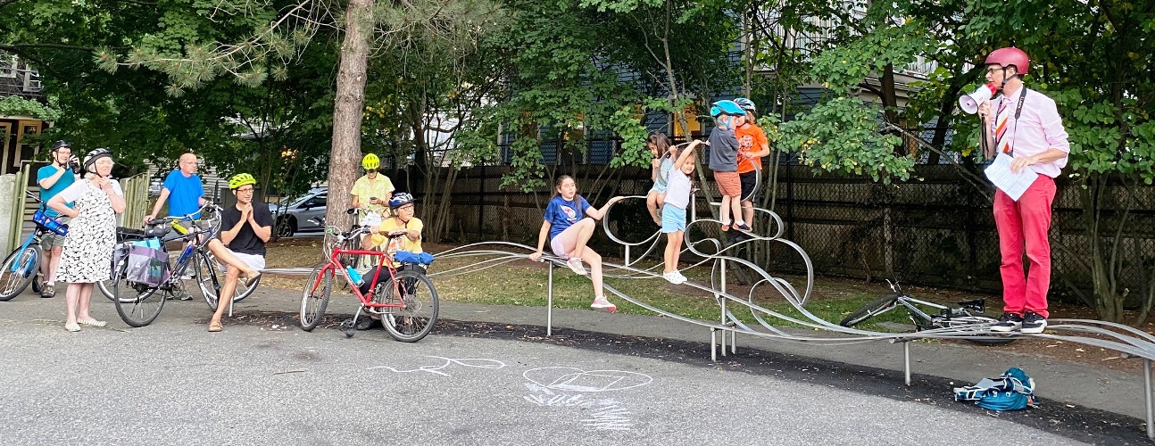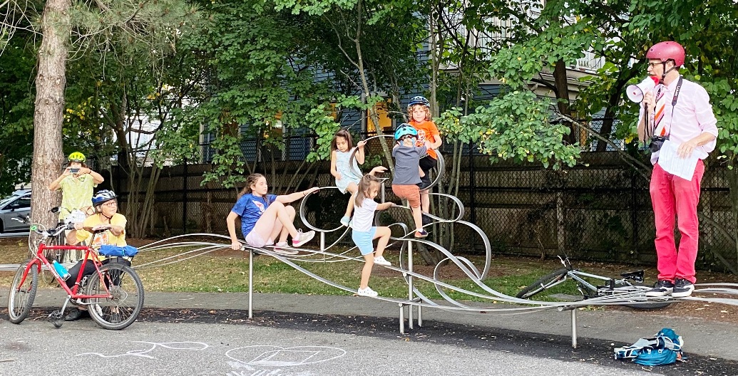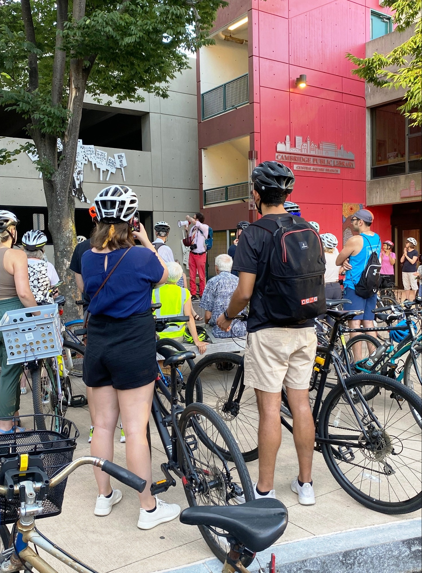 This post notes outstanding outcomes of an exciting event one perfect evening in late July 2022: the beautifully organized free bike tour of Cambridge public art between Central Square and the Charles River. 1. Bike-riders of all ages gathered outside the Central Square Library for an overview of art around the library and along the planned route of the whole tour. Cambridge police and attentive volunteers guided everyone safely through the sunset finale. 2. The tour is now engagingly documented in a 2-minute video. 3. The route has become a self-guiding tour for cyclists, though certainly adaptable to walkers. Facts, links and videos on the tour site are informative and intriguing for interested readers far from Cambridge. 4. The whole experience even elevated my already towering enthusiasm for public art!