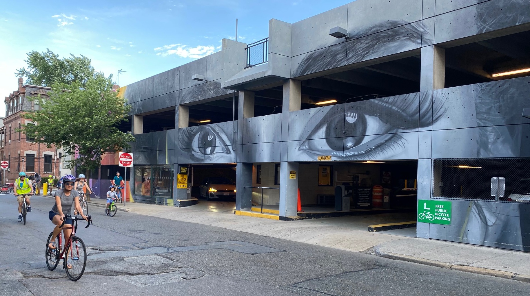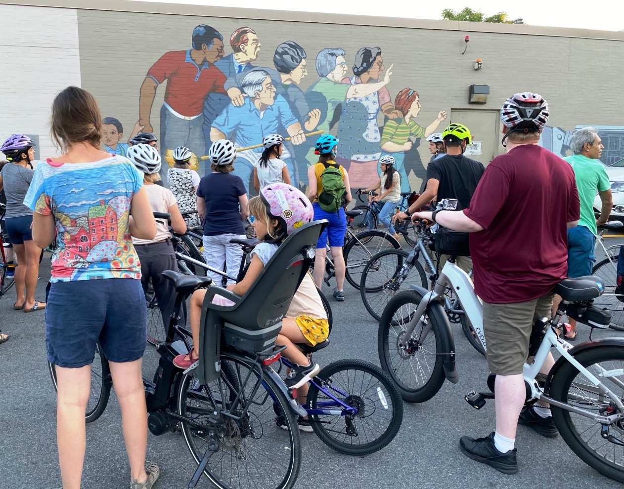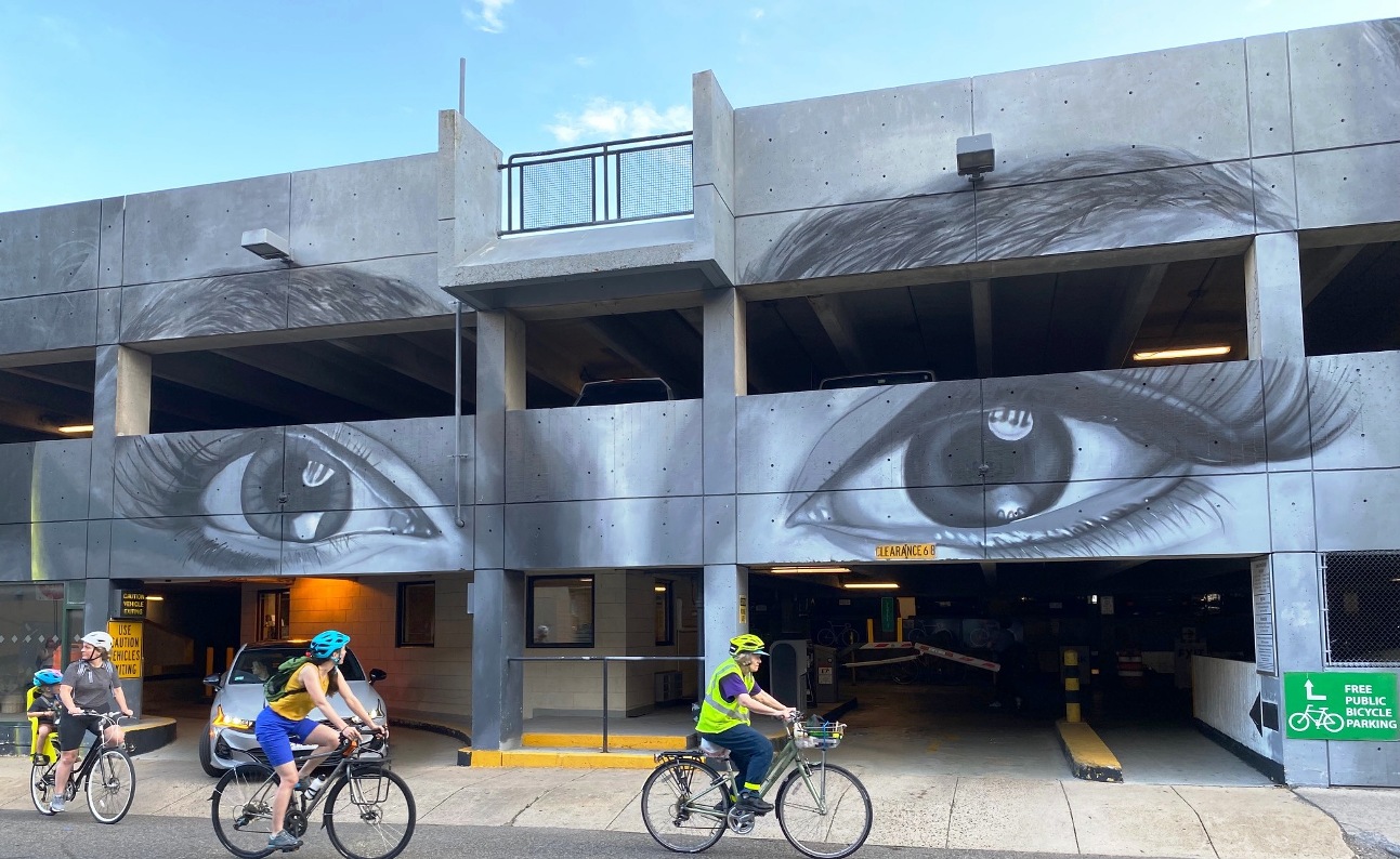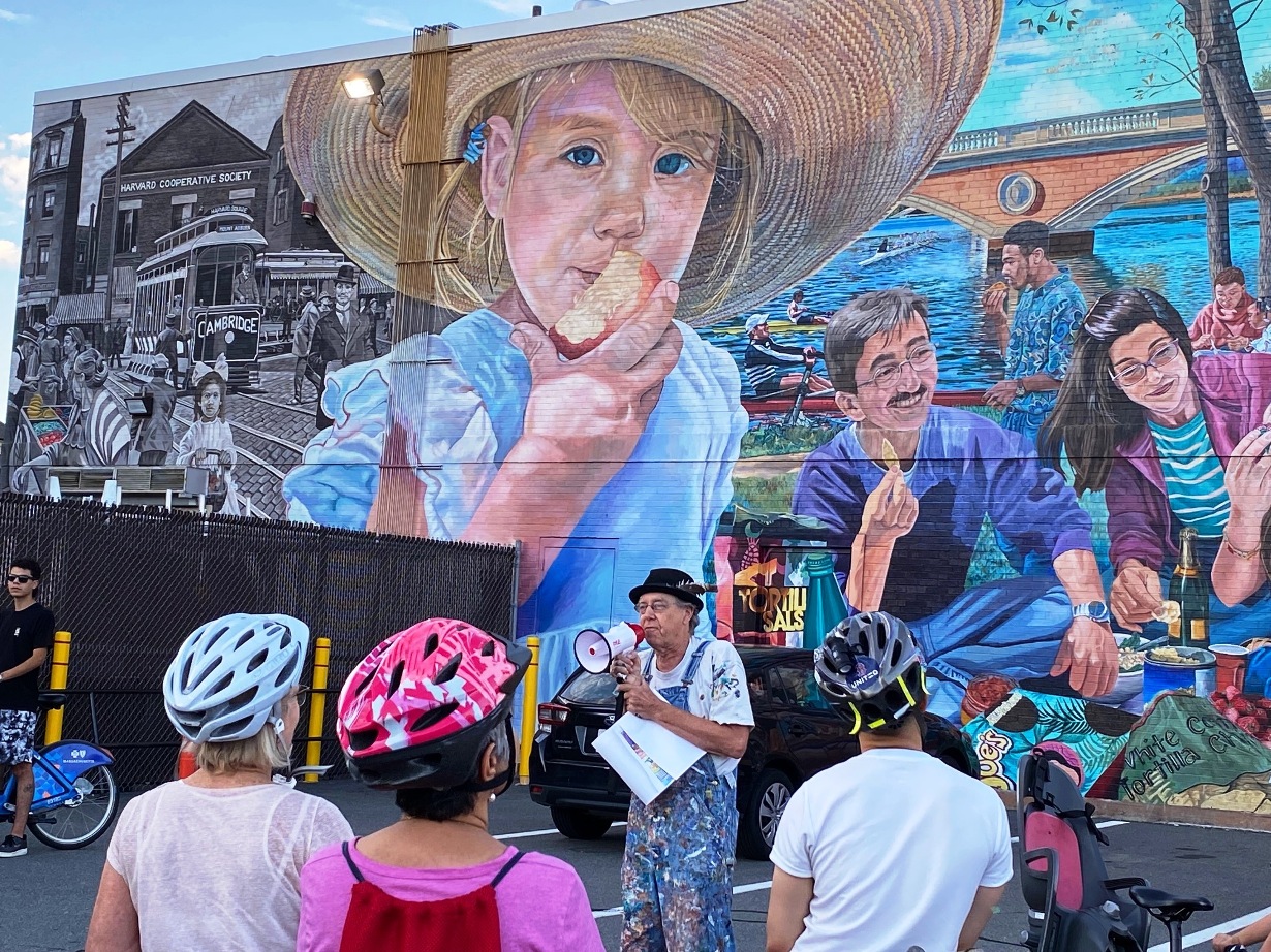 “The art on the tour addresses civil rights, community activism, wildlife in Cambridge, and other themes. Around the library and Green Street parking garage, we’ll see mosaics by Lilli Ann Rosenberg; a stairway installation by Edwin Andrews; murals by Cedric Douglas and Silvia López Chavez; graphics by John Powell; and a poem by Benjamin Tolkien.” ( quote from bike tour description )