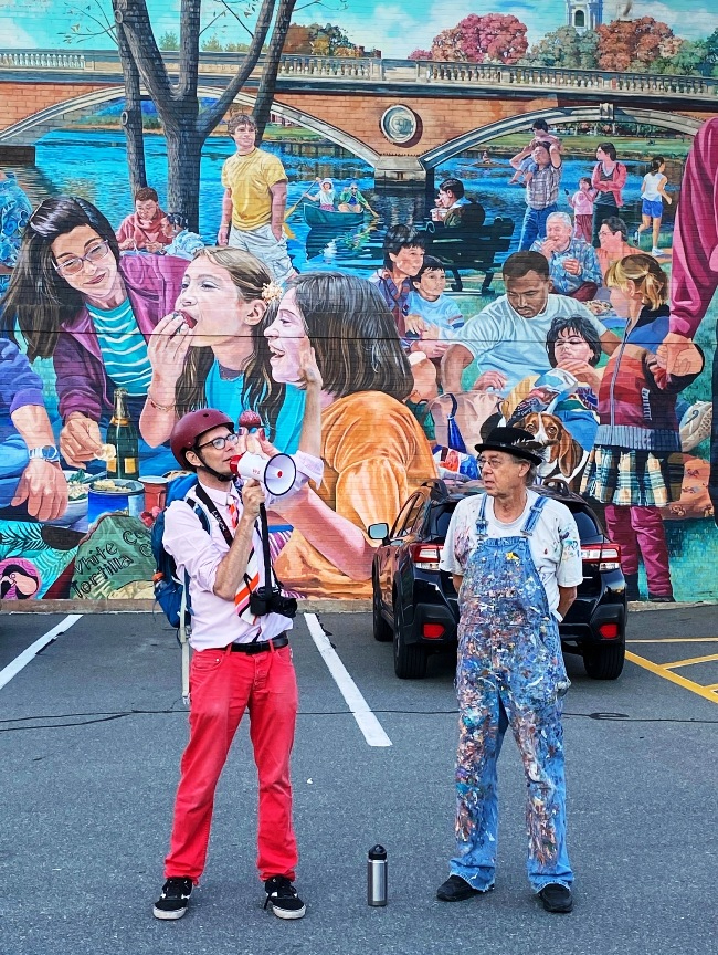 Earlier ART OUTDOORS posts related to a few points on the tour: AFRICAN MASKS GENERATED ART IN RESTORED SCULPTURES BY VUSUMUZI MADUNA ; MORE NEW MURALS: SILVIA LÓPEZ CHAVEZ IN CAMBRIDGE, IMAGINE (SNEHA SHRESTHA) IN SOMERVILLE ; Large lovely new nests rest on granite posts designed decades ago by William Reimann; MURALS OFFER MANY WAYS TO CELEBRATE A CITY: “CHELSEA RESILIENT: CALL AND RESPONSE THROUGH THE AGES” AND “CITY OF DREAMS”