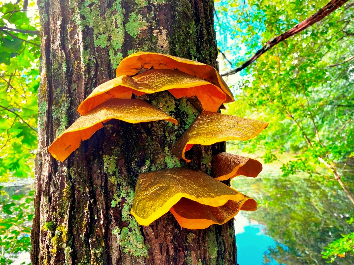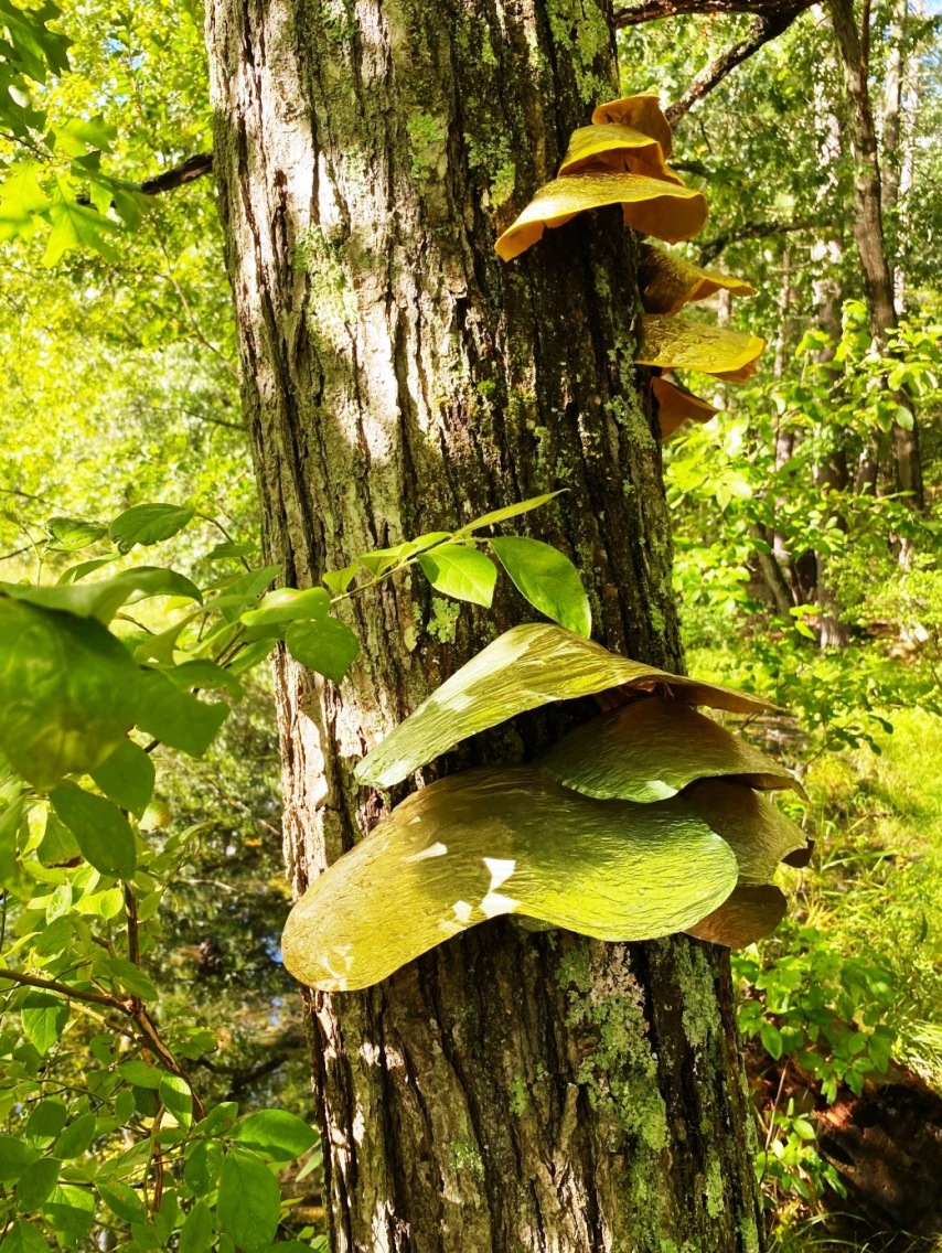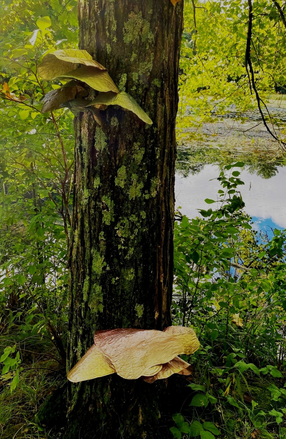 “This installation is a representation of chanterelle and chicken of the woods, which are a polypore fungi. Polypores are a group of fungi that form large fruiting bodies with pores or tubes on the underside. They are found on wood, and their job is to break down the lignins in the wood. Fungi are great recyclers.” ( from Laurie Bogdan’s statement about Symbiotic )