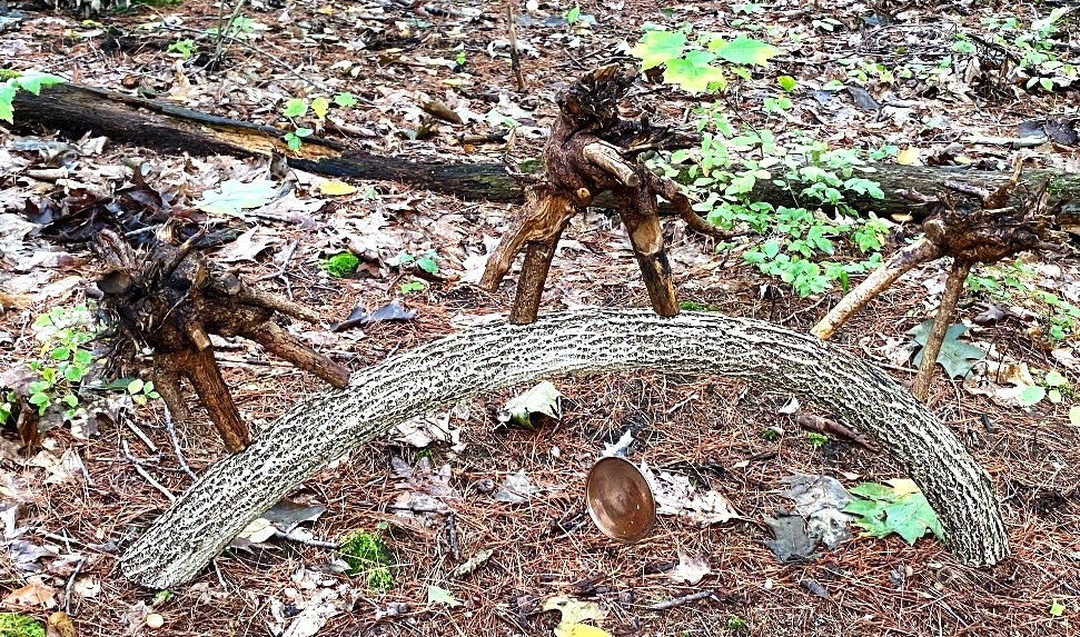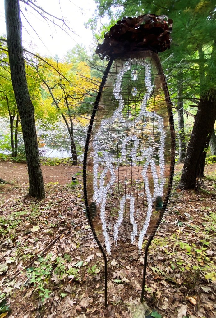 This third post completes the series of related posts for 2022 ART RAMBLE, “In the Balance,” with photos, quotes, and links for three more of the eleven artists* (four more of the seventeen installations*). The first post includes an overview. All three note the curator talk on October 16 and other valuable resources. Whether I post again before the final day, November 19, I intend to revisit and reflect on significant connections between the forest and the artworks!